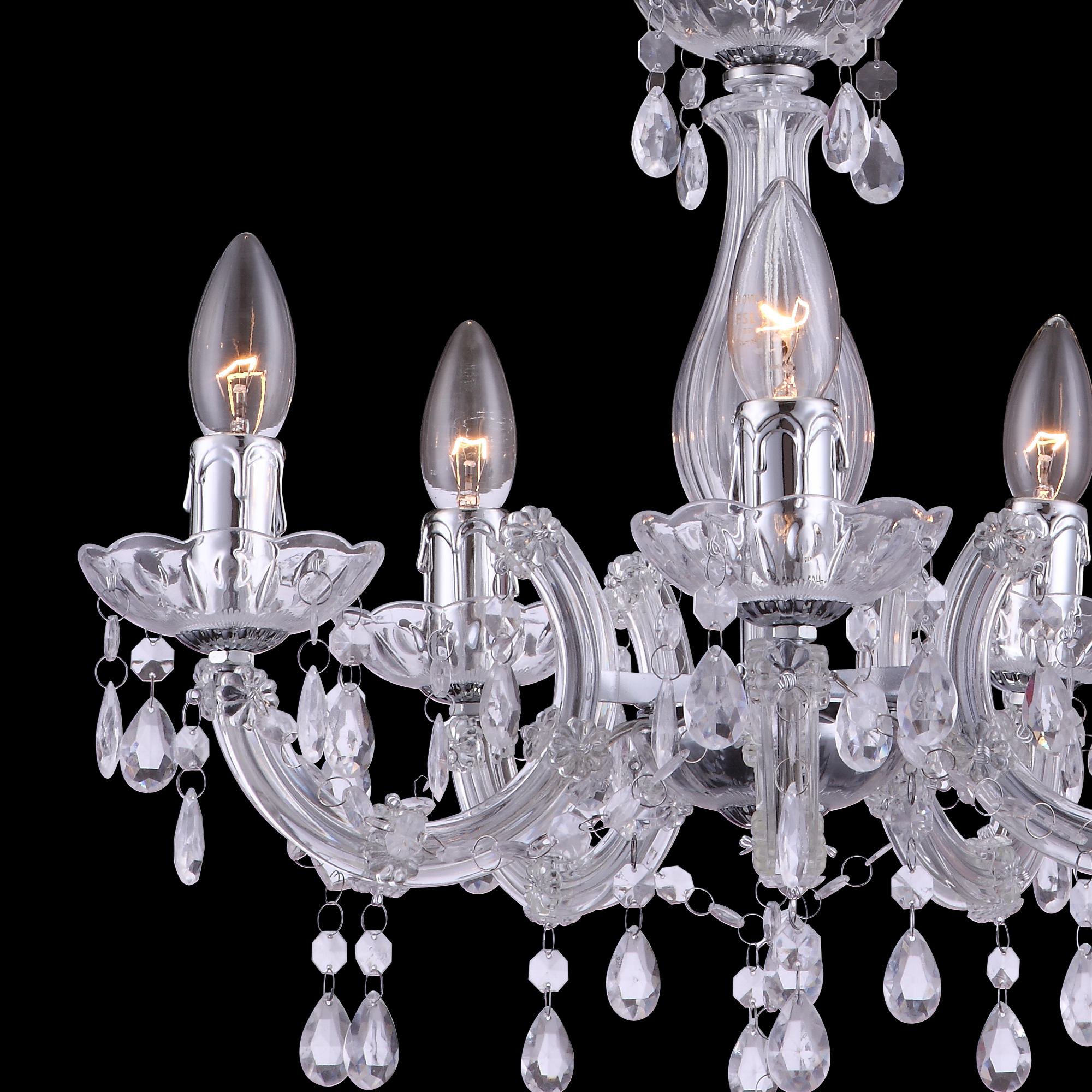 Zaujme svojím honosným prevedením v podobe klasického lustra. Ten je vyrobený z kovu v chrómovej farbe a akrylových kryštálov, ktoré zdobia celú konštrukciu. Perfektným detailom sú pätice s imitáciou stekajúceho vosku, ktoré dotvárajú celkový dizajn svietidla. Bude ideálnym doplnkom nad konferenčný či jedálenský stôl. Odporúčame zvoliť žiarovky v tvare sviečky.