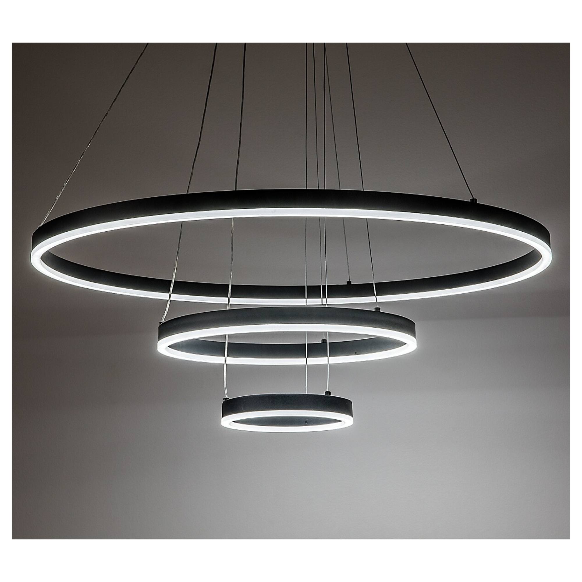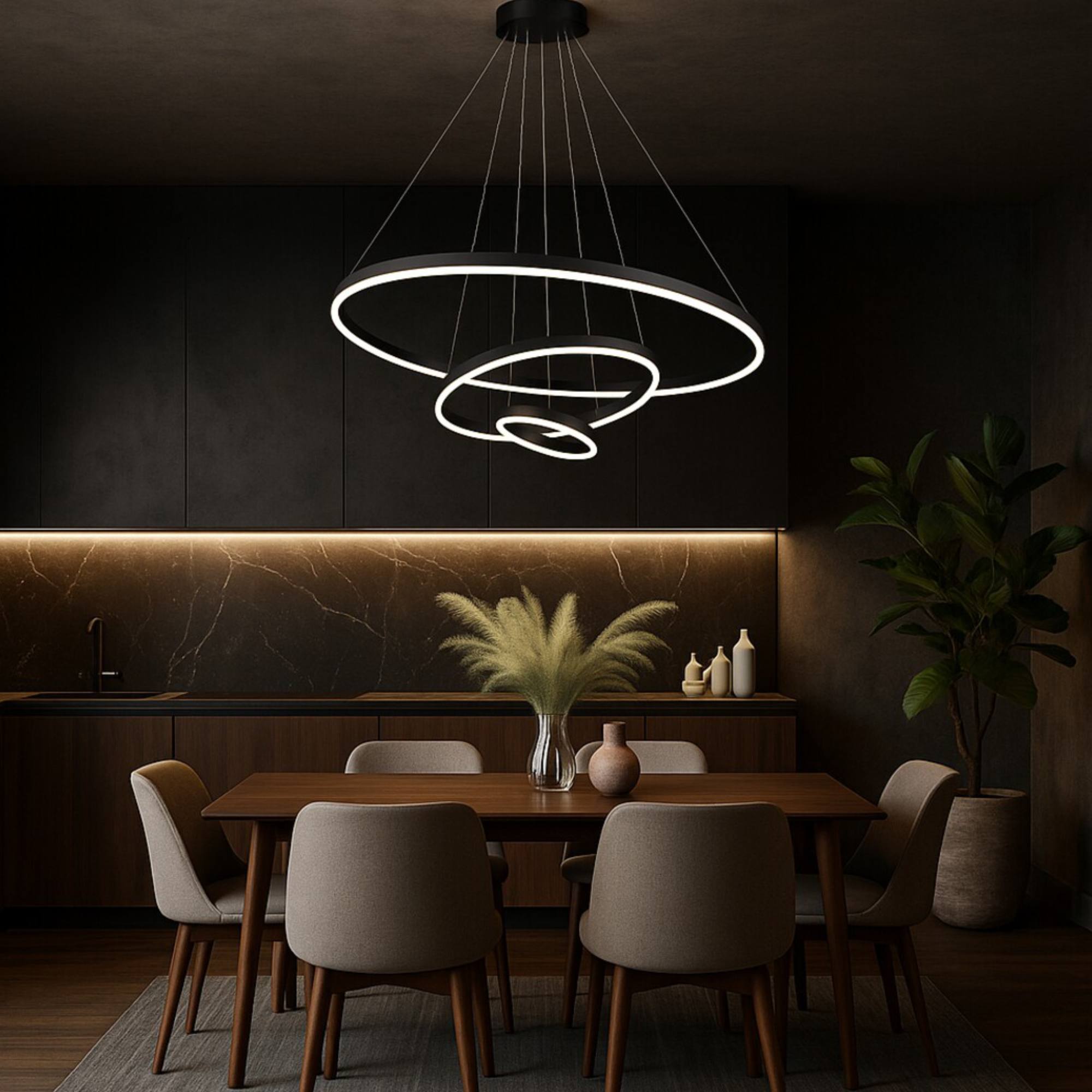 Zaujme svojou konštrukciou, zloženou z 3 rôzne veľkých kruhov, ktoré zo svietidla vytvárajú jedinečný dizajnový prvok každej miestnosti. Kruhy je navyše možné nastaviť podľa potreby pomocou kovových laniek. Je vyrobené z kovu a zavesené na okrúhlej základni. Bude ideálnym osvetlením nad konferenčný alebo jedálenský stôl.