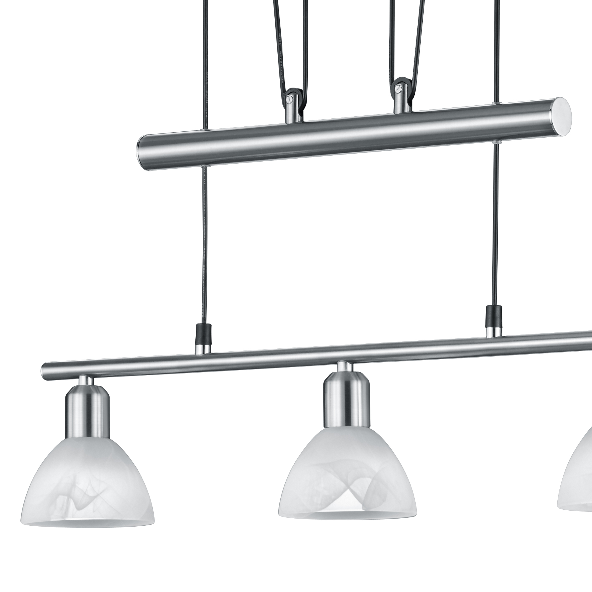 Má robustnú kovovú konštrukciu v striebornej farbe, na ktorej sú pripevnené 3 tienidlá z alabastrového skla. Tie rovnomerne rozptyľujú svetlo po miestnosti a dodávajú svietidlu elegantný vzhľad. Praktickým prvkom je nastaviteľná výška 95–160 cm, ktorá umožňuje prispôsobenie podľa vašej potreby. Je ideálnym osvetlením nad konferenčný alebo jedálenský stôl.