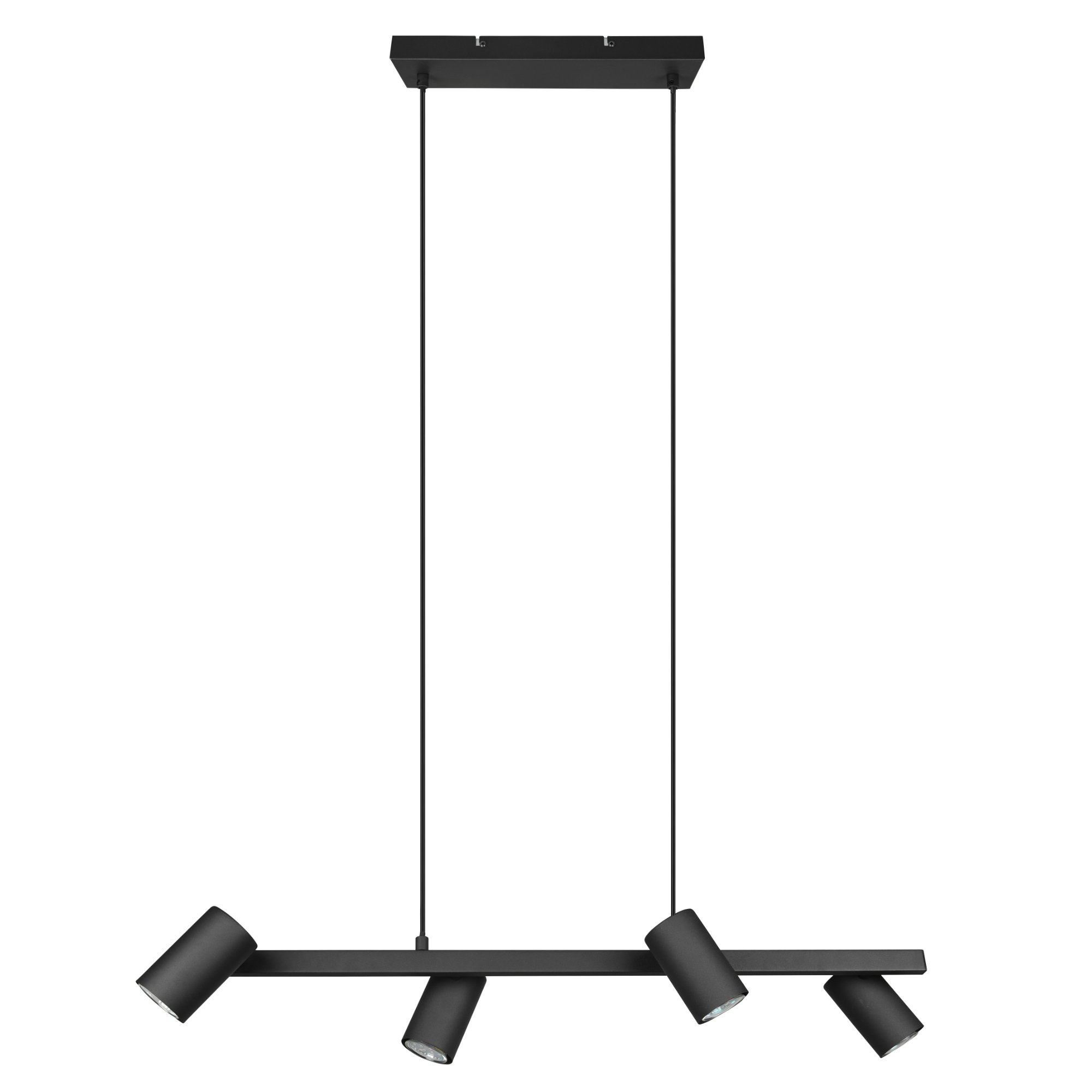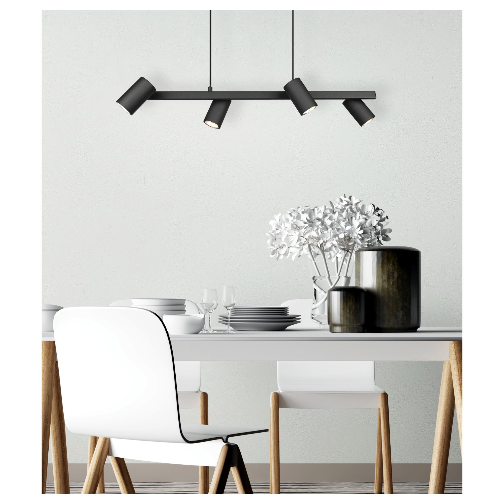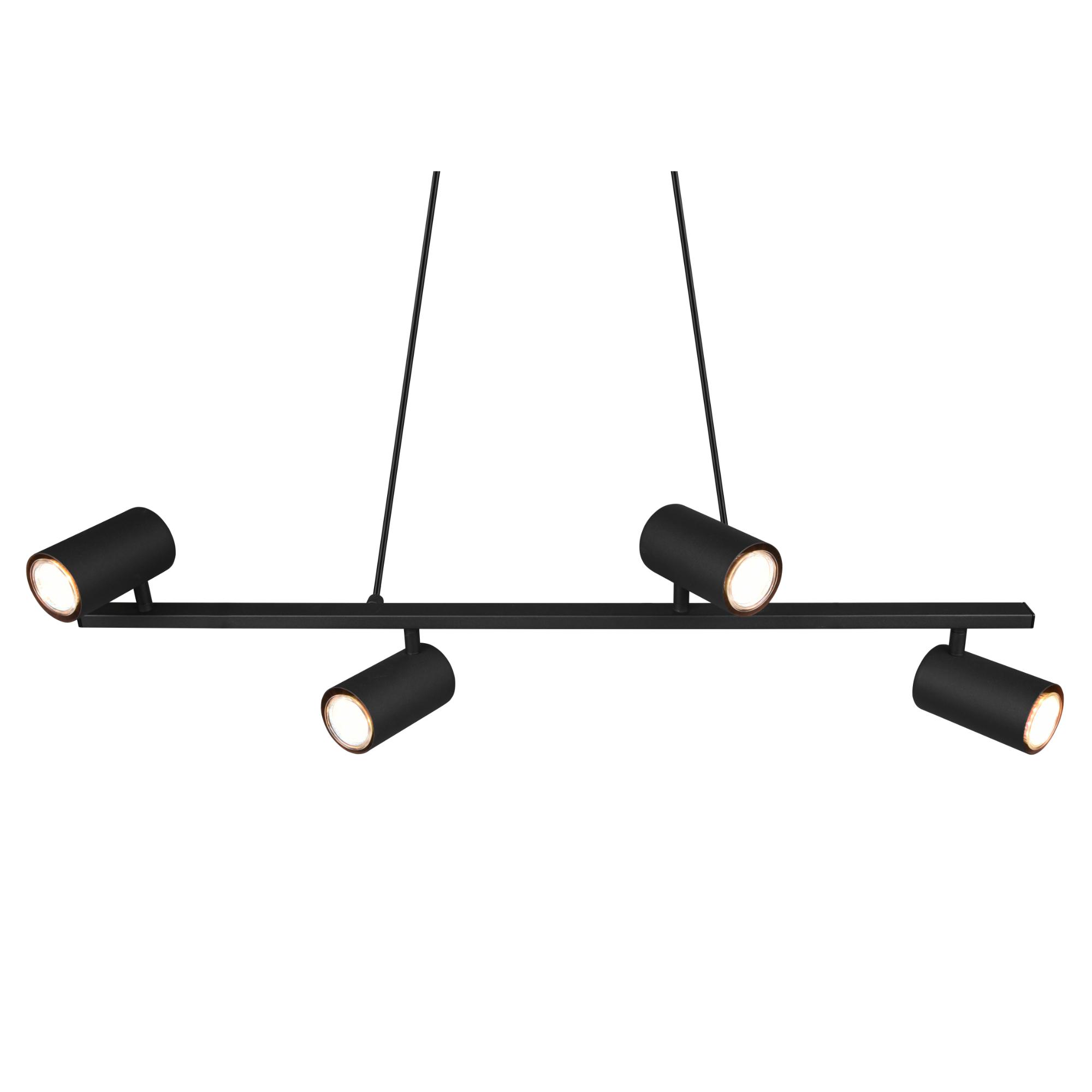 Má kovovú konštrukciu so šírkou 80 cm v matnej čiernej farbe, ktorú dopĺňajú 4 tienidlá. Vďaka svojej veľkosti bude stredobodom pozornosti a zároveň ho ľahko zladíte s interiérom vďaka jeho jednoduchému dizajnu. Praktickým prvkom svietidla je nastaviteľná výška, čo umožňuje prispôsobenie podľa vašich potrieb.