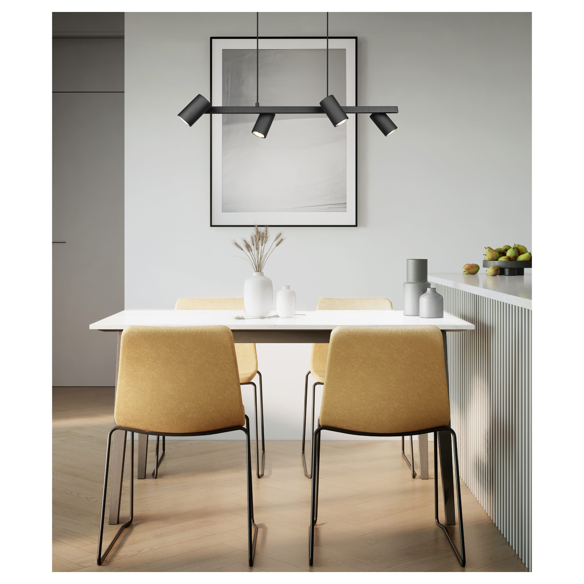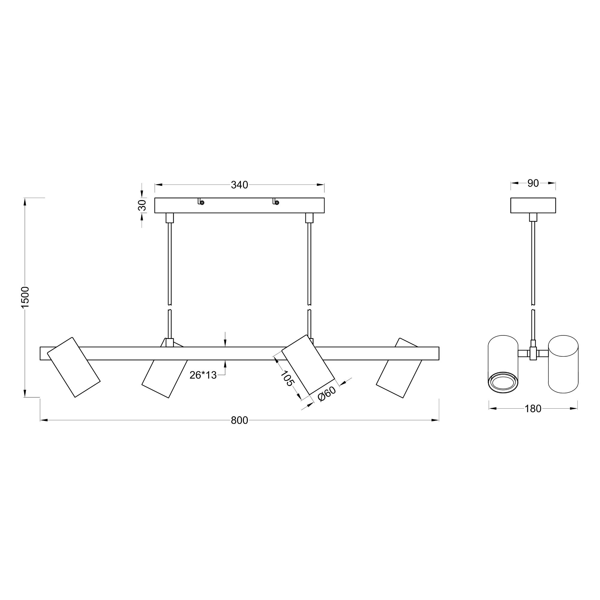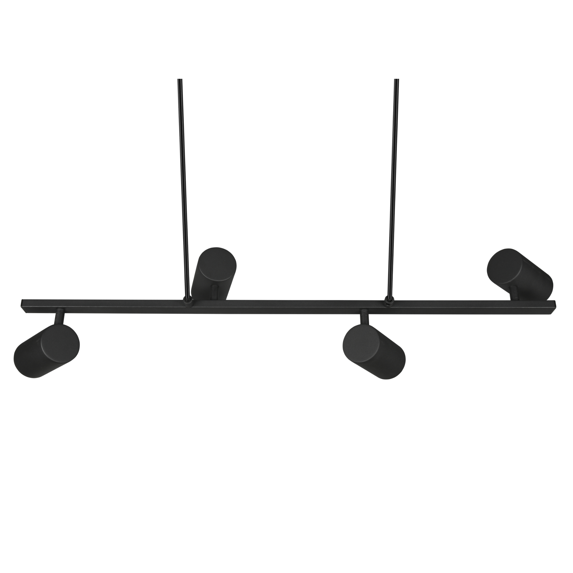 Má kovovú konštrukciu so šírkou 80 cm v matnej čiernej farbe, ktorú dopĺňajú 4 tienidlá. Vďaka svojej veľkosti bude stredobodom pozornosti a zároveň ho ľahko zladíte s interiérom vďaka jeho jednoduchému dizajnu. Praktickým prvkom svietidla je nastaviteľná výška, čo umožňuje prispôsobenie podľa vašich potrieb.