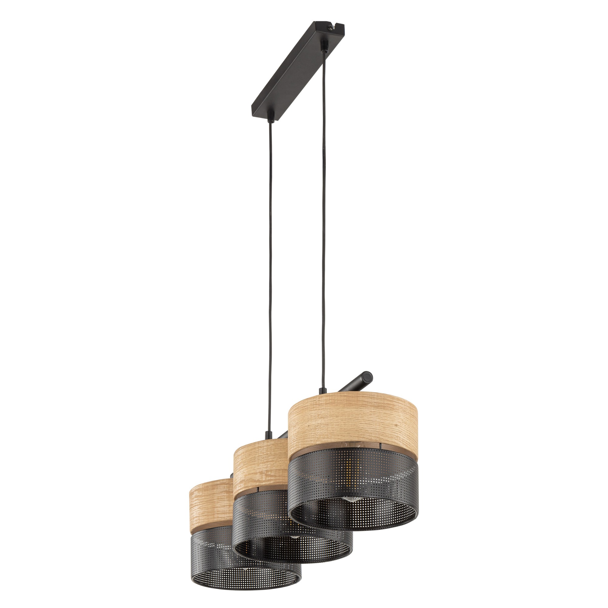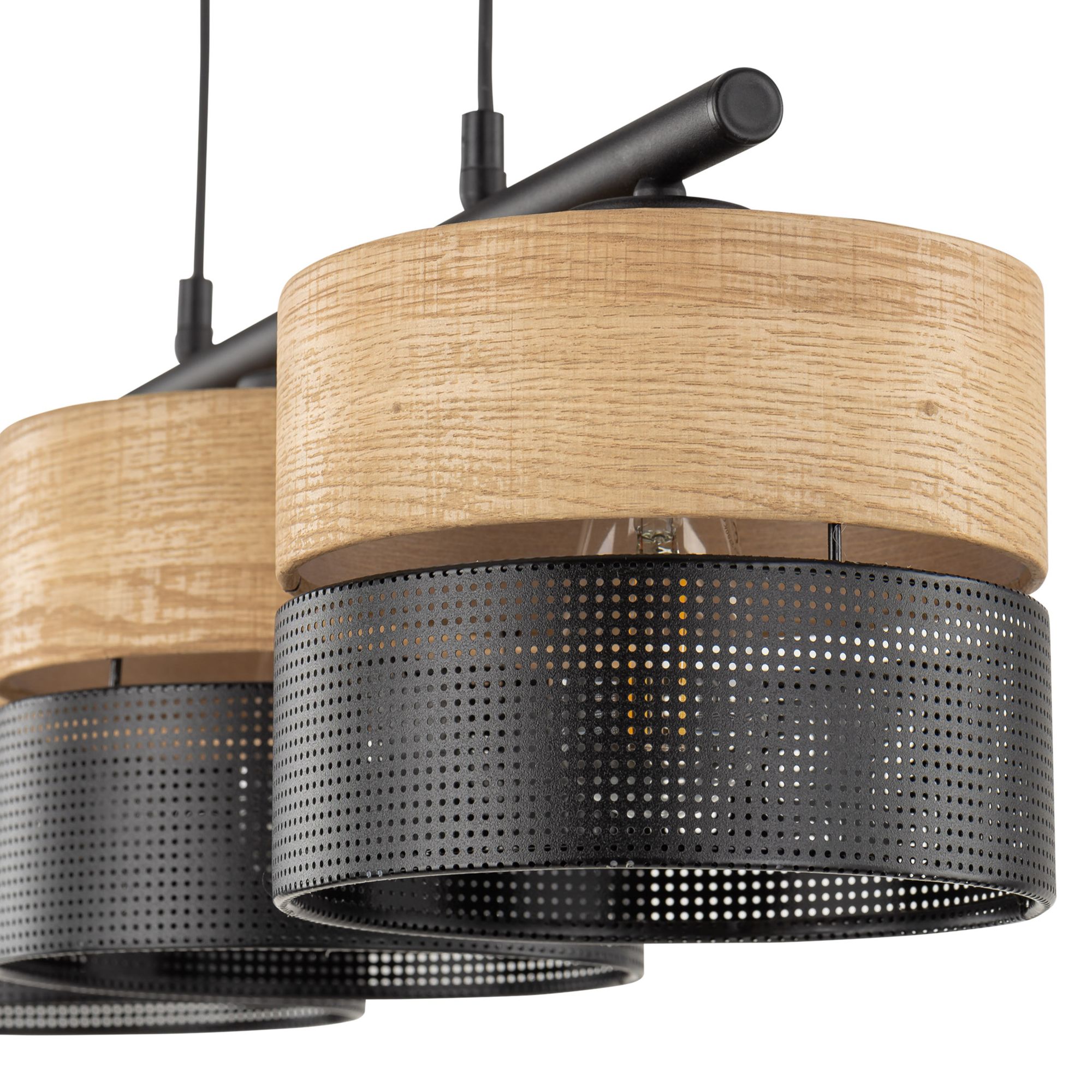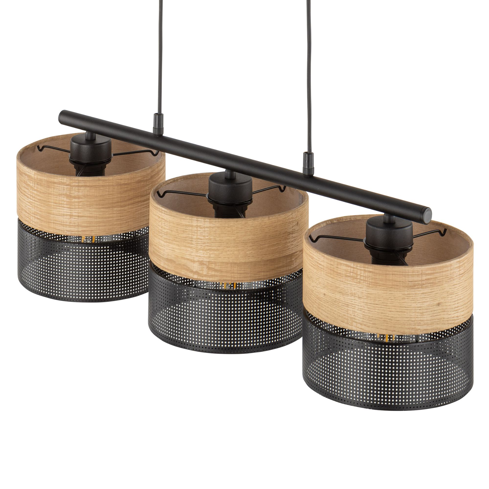 Má čiernu kovovú konštrukciu, na ktorej sú pripevnené 3 kruhové tienidlá. Tie sa skladajú z dvoch častí – vrchnej béžovej fólie s dekorom dreva a spodnej čiernej fólie s perforáciou, ktorá sa postará o atmosférické osvetlenie. Svietidlo tak štýlovo doplní vašu obývačku, jedáleň aj spálňu.
