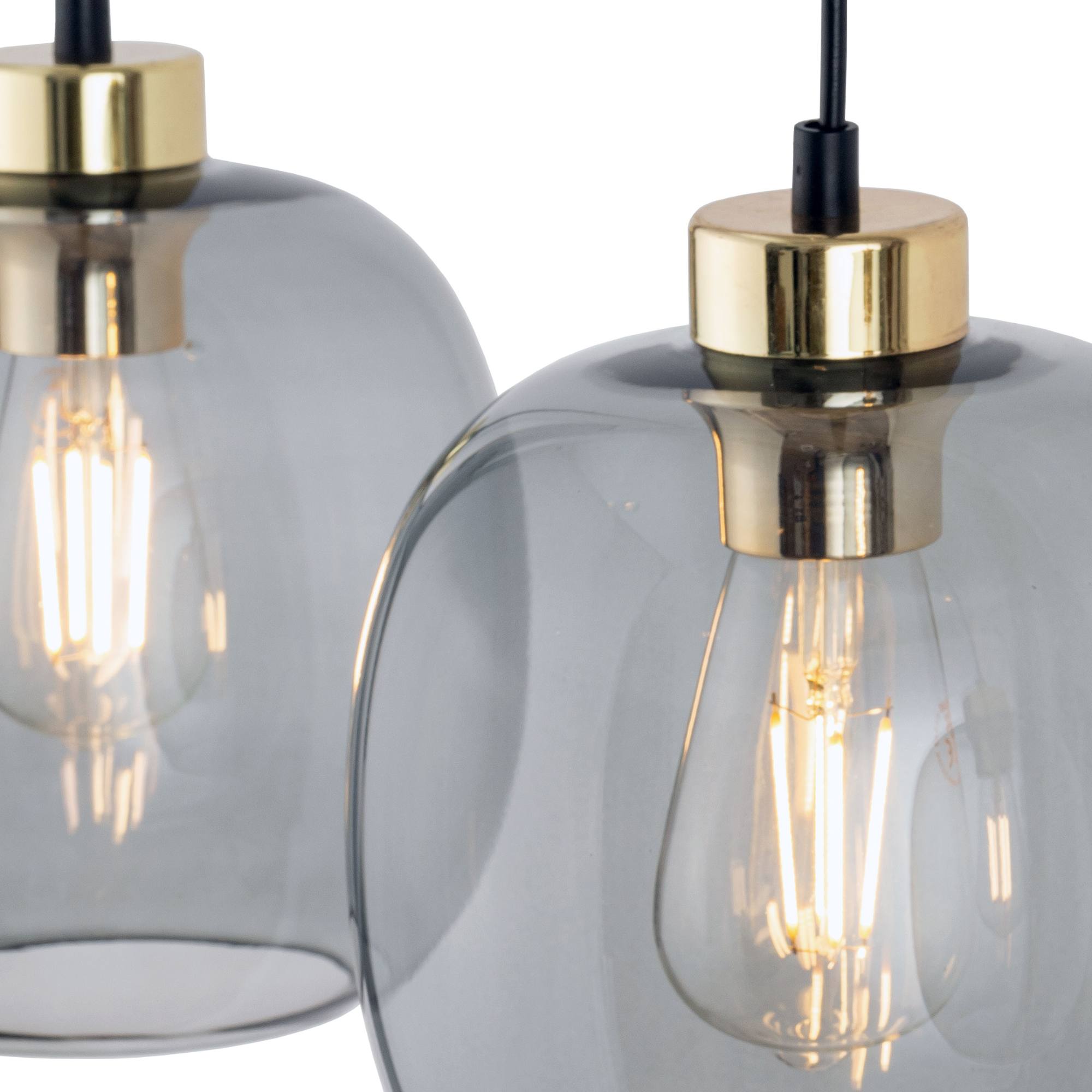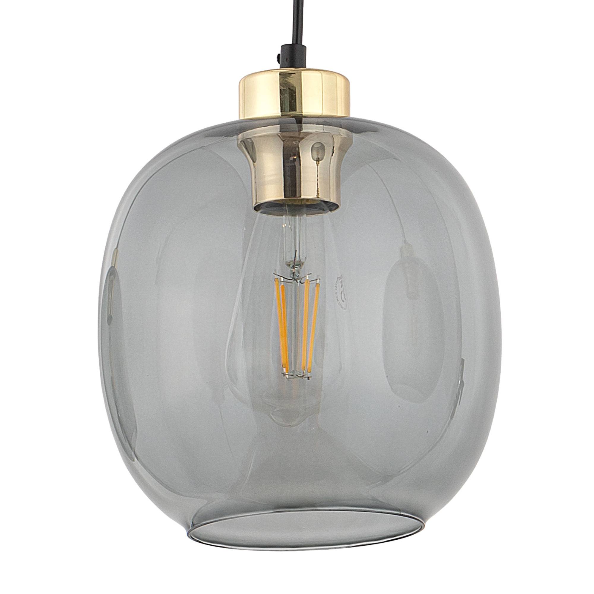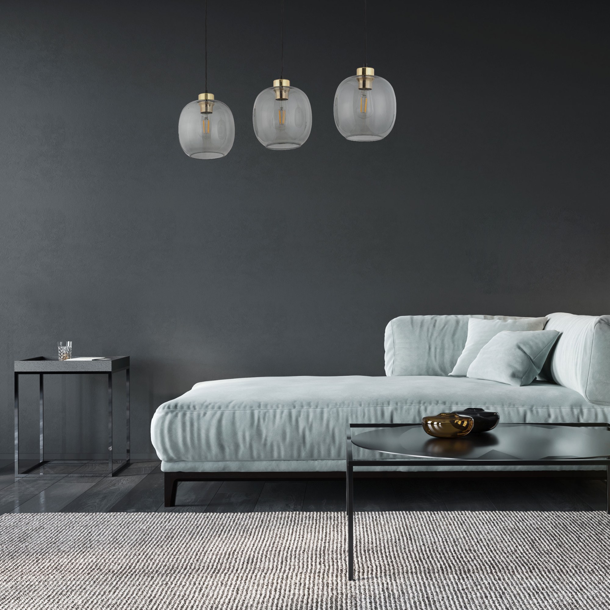 Má čiernu základňu so šírkou 84 cm, na ktorej sú zavesené 3 tienidlá so zlatým detailom. Sú vyrobené zo skla s použitím dymového efektu, ktorý im dodáva jedinečný retro nádych. Je ideálnym osvetlením nad konferenčný alebo jedálenský stôl. Odporúčame použiť žiarovky v retro dizajne, napríklad so špirálovou diódou, čím posuniete svietidlo na vyššiu úroveň.