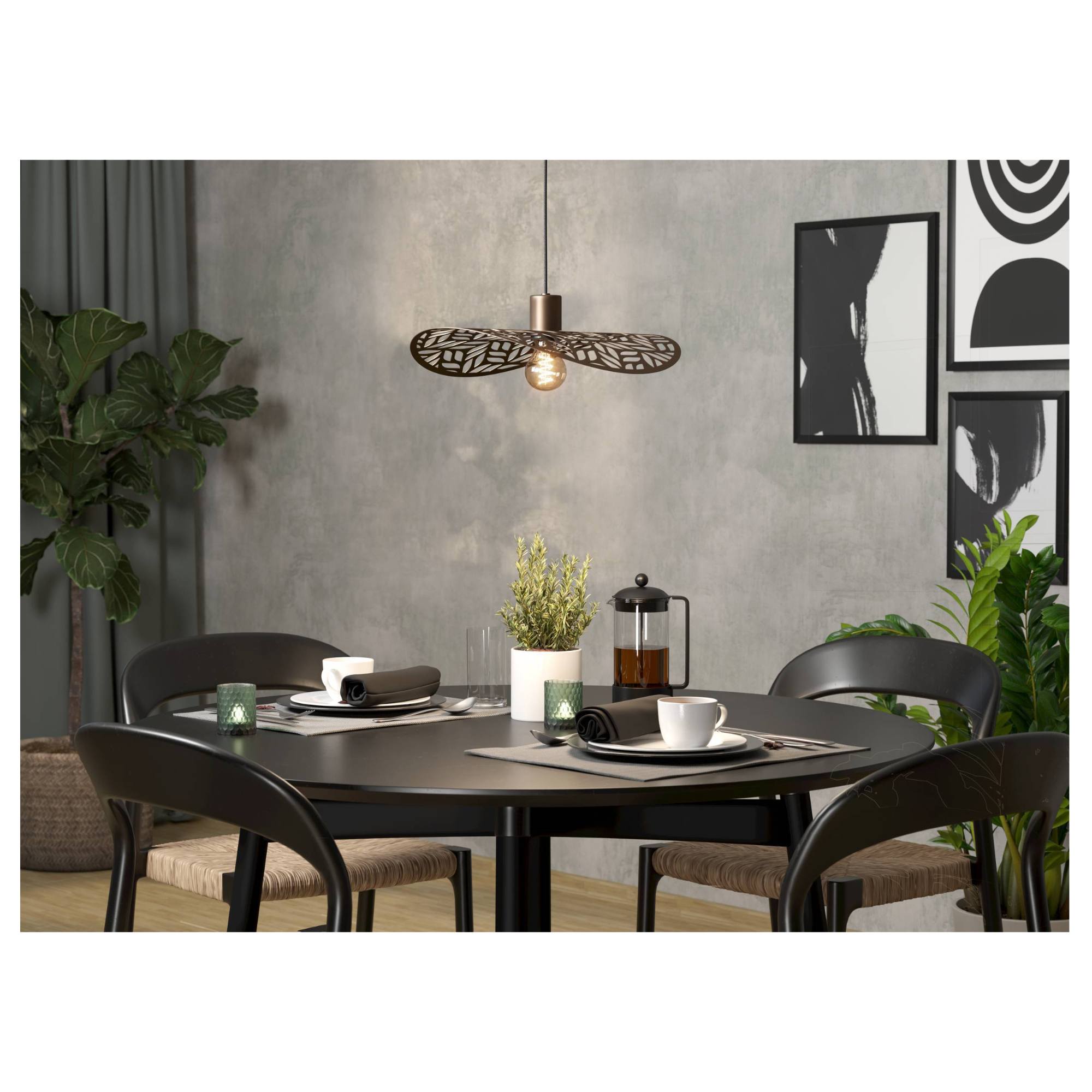 Má kovovú konštrukciu v bronzovej farbe, ktorá zaujme svojím unikátnym tienidlom zaveseným na kábli vo výške 110 cm. To je vyvedené v kruhovom tvare s vyrezávaným motívom lístkov, ktoré pri rozsvietení svetla vytvoria v miestnosti čarovné osvetlenie. Doplňte svietidlo zaujímavou žiarovkou a získate tak originálny doplnok do vášho interiéru.