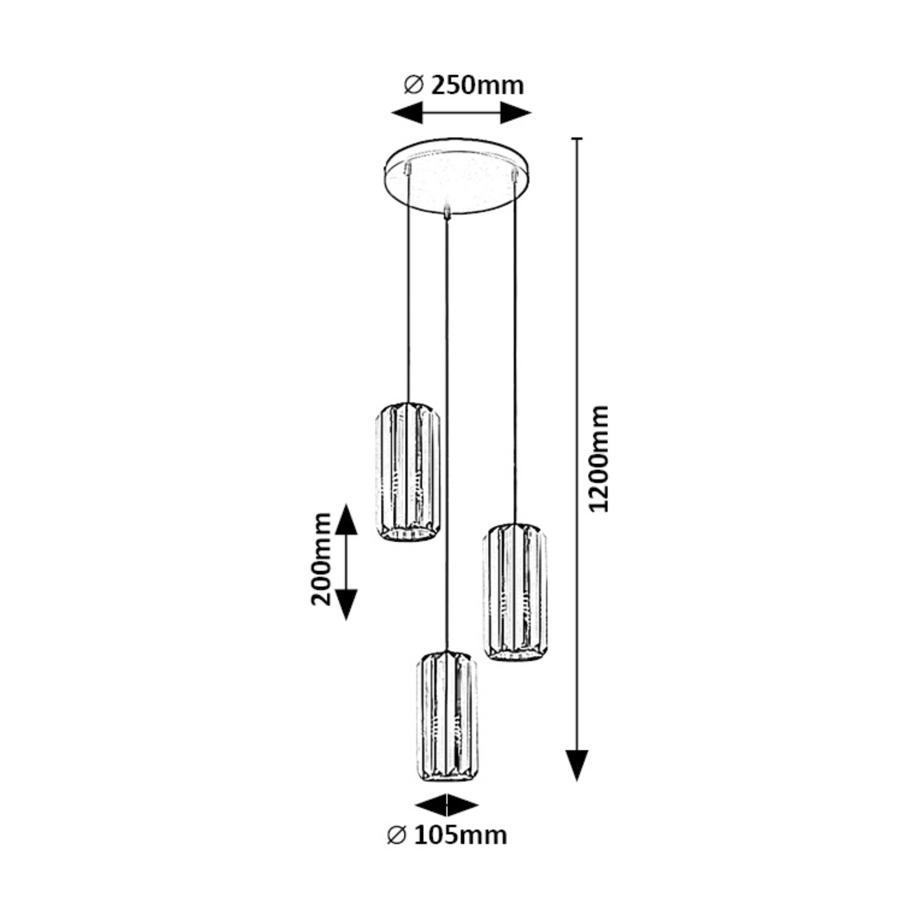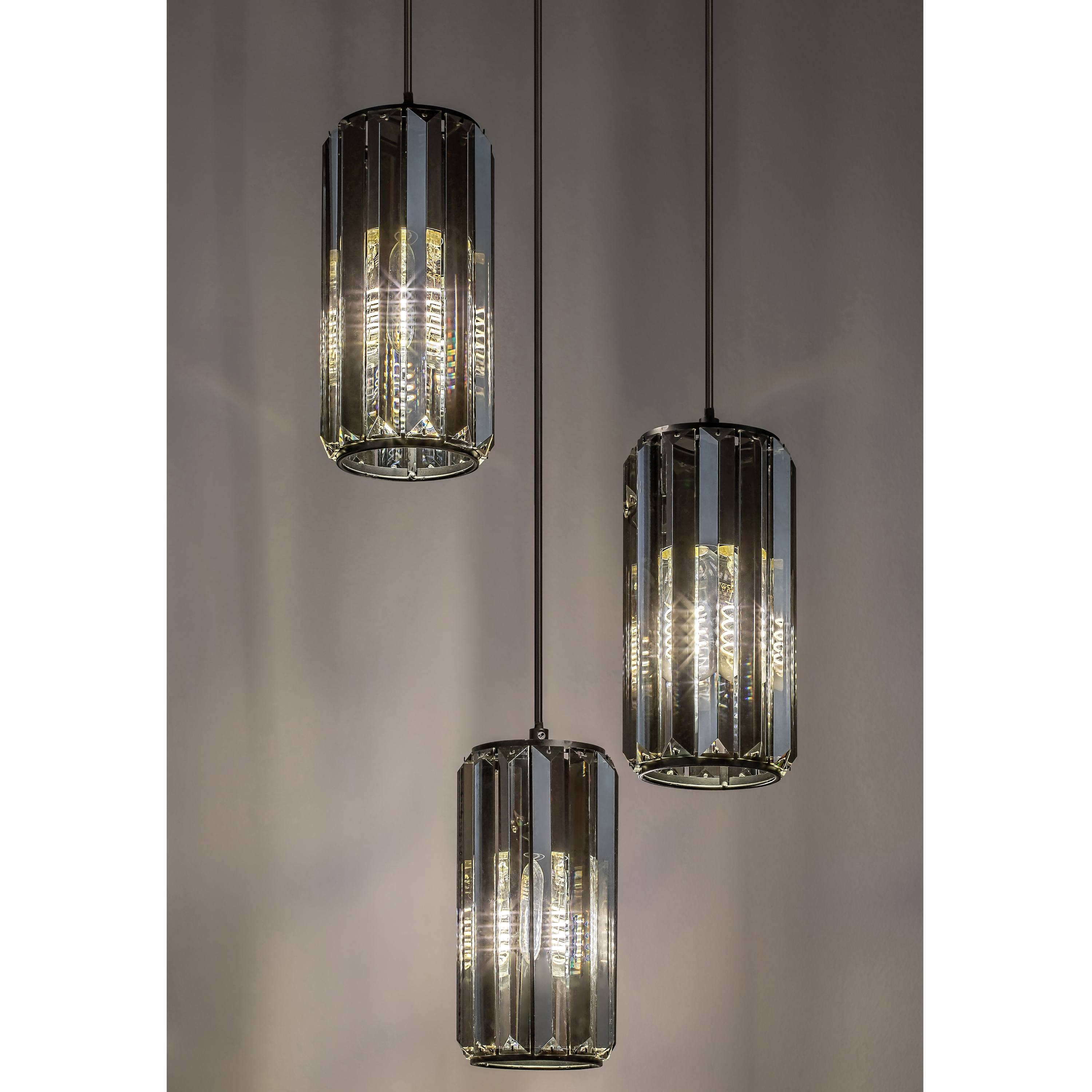 Kovové telo dopĺňajú valcovité tienidlá z tónovaného, fazetového skla, ktoré príjemne rozptyľujú svetlo a vytvárajú zaujímavý svetelný efekt. Svietidlo je výškovo nastaviteľné, takže ho jednoducho prispôsobíte priestorovým možnostiam, a je ideálne na zavesenie nad jedálenský stôl, kuchynský ostrovček, do obývacej izby či ako dekoratívne osvetlenie v spálni.