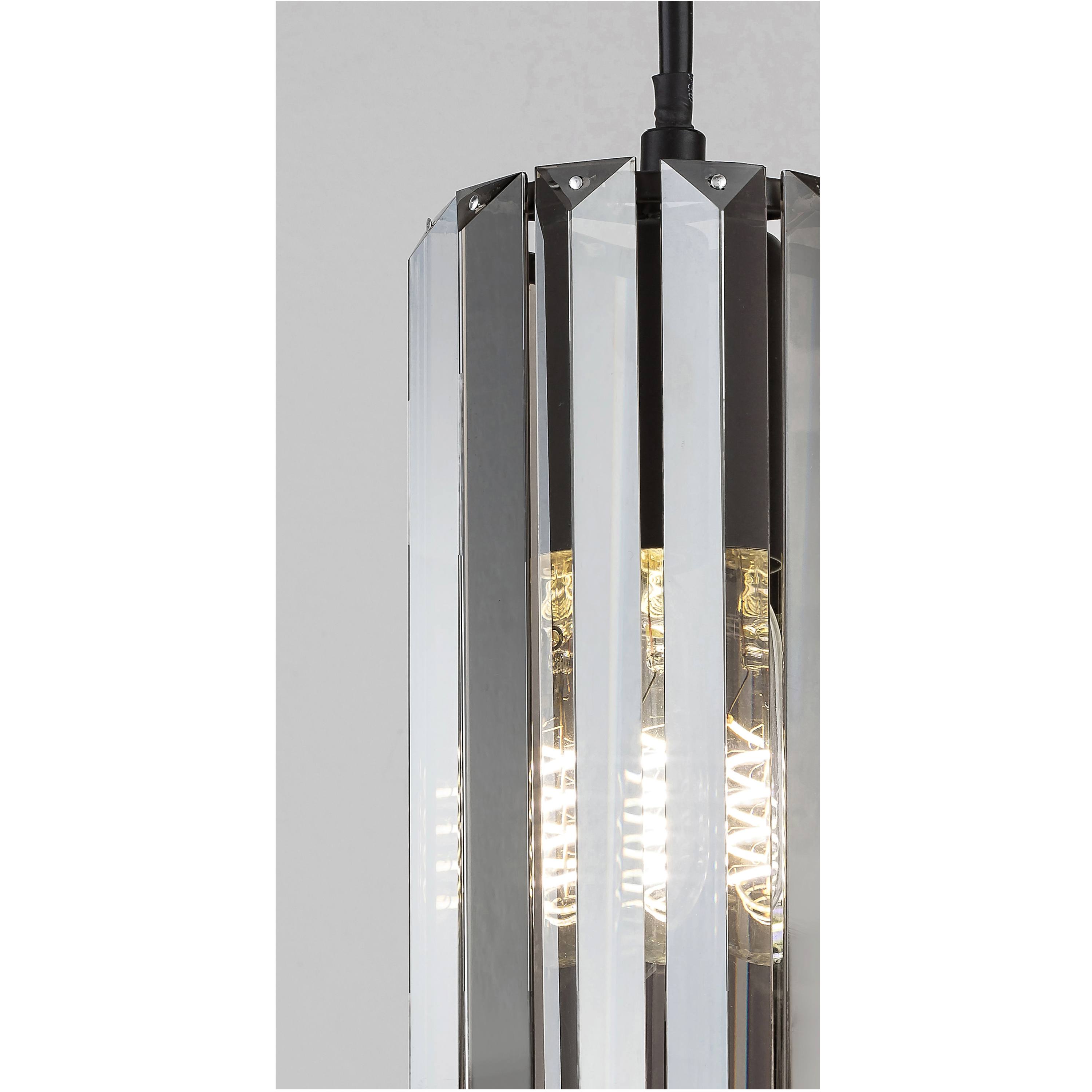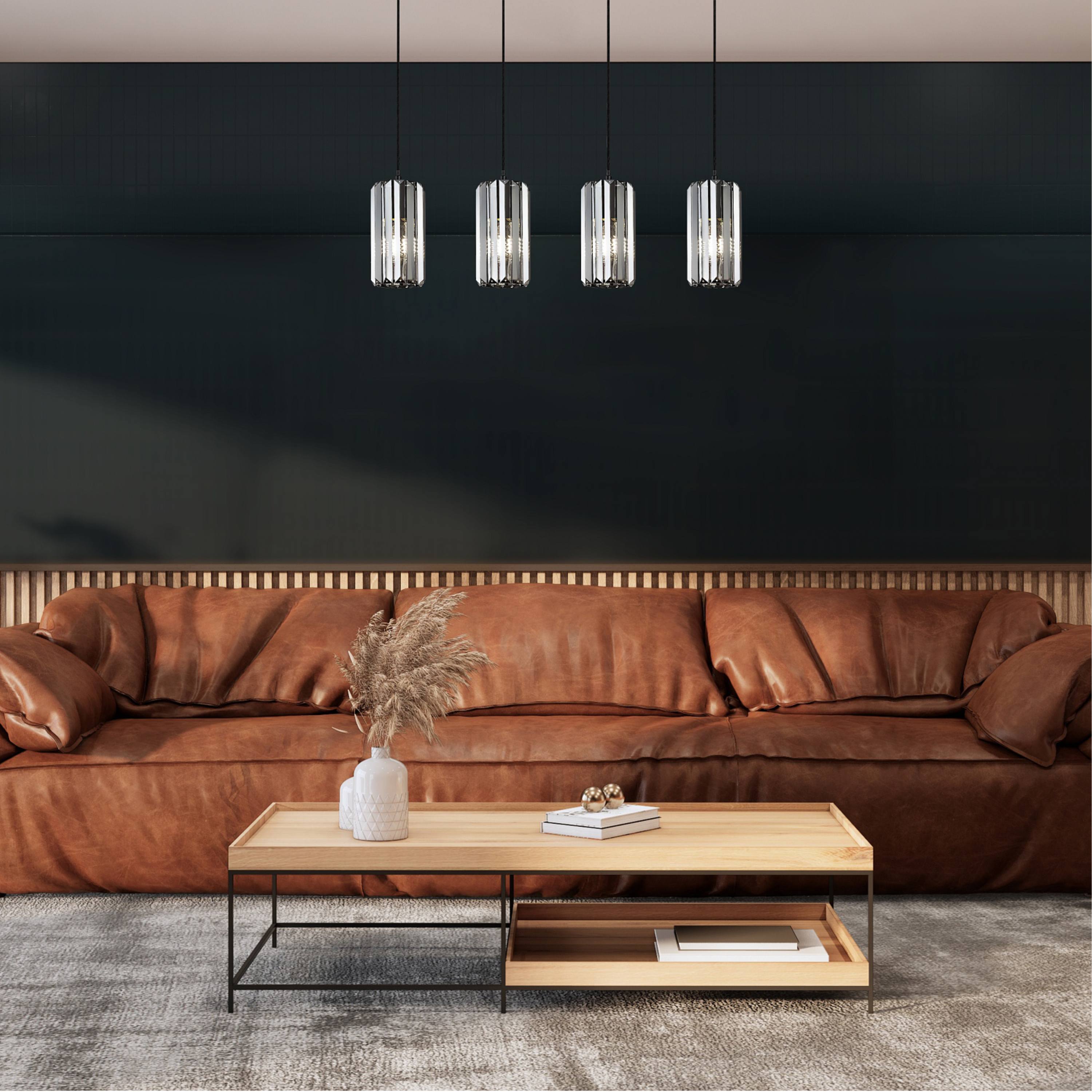 Kovové telo dopĺňajú valcovité tienidlá z tónovaného, fazetového skla, ktoré príjemne rozptyľujú svetlo a vytvárajú zaujímavý svetelný efekt. Svietidlo je výškovo nastaviteľné, takže ho jednoducho prispôsobíte priestorovým možnostiam, a je ideálne na zavesenie nad jedálenský stôl, kuchynský ostrovček, do obývacej izby či ako dekoratívne osvetlenie v spálni.