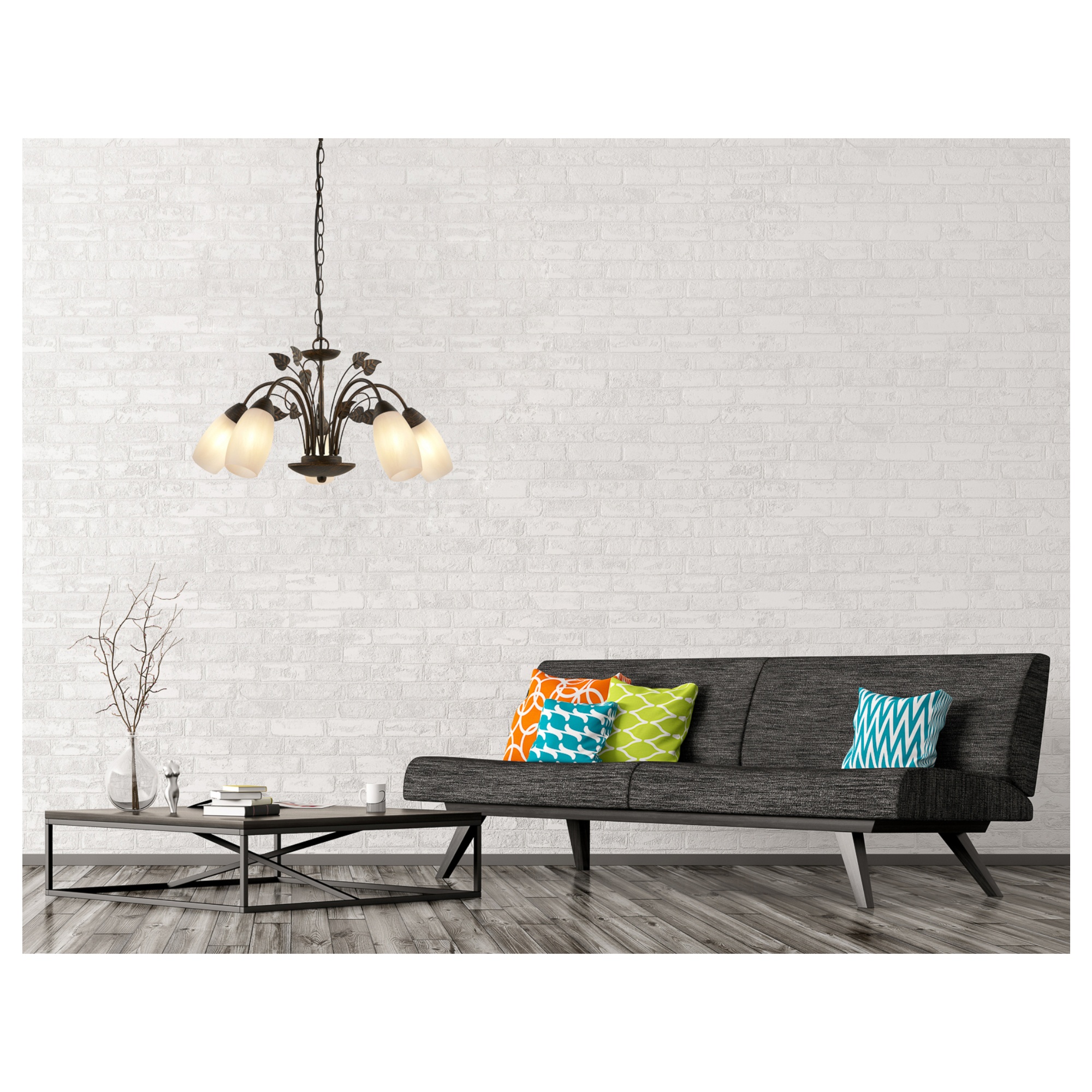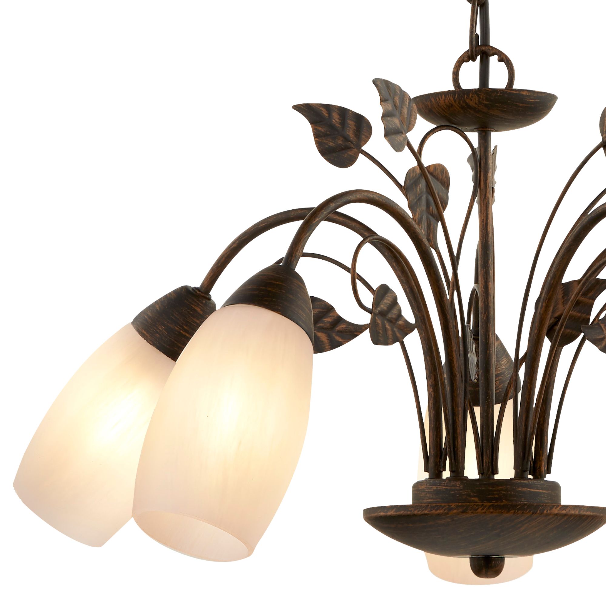 Zaujme svojou kovovou konštrukciou v čiernohnedej farbe imitujúcej hrdzu. V kombinácii so zaujímavým dizajnom kovových lístkov vytvára originálny doplnok. Tienidlá sú vyrobené z alabastrového skla, ktoré jemne rozptýli svetlo po miestnosti a dodáva svietidlu štýlový vzhľad. Vďaka výške 150 cm je ideálnym osvetlením do väčších miestností, ako je obývacia izba či jedáleň.