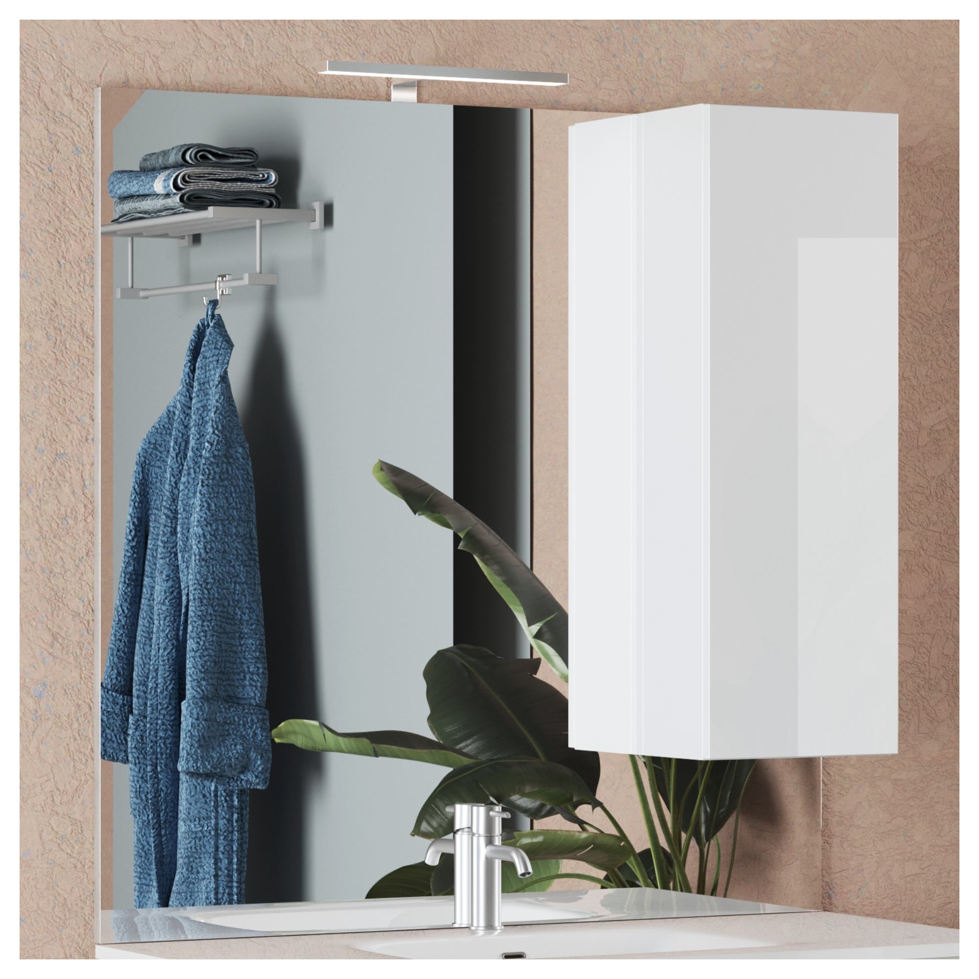 Priestranná zrkadlová plocha je doplnená o praktické LED osvetlenie na spríjemnenie vašej rannej či večernej rutiny. **Uzatvárateľná závesná skrinka* s otočnými dverami ponúka dostatok miesta na uloženie obľúbenej kozmetiky.