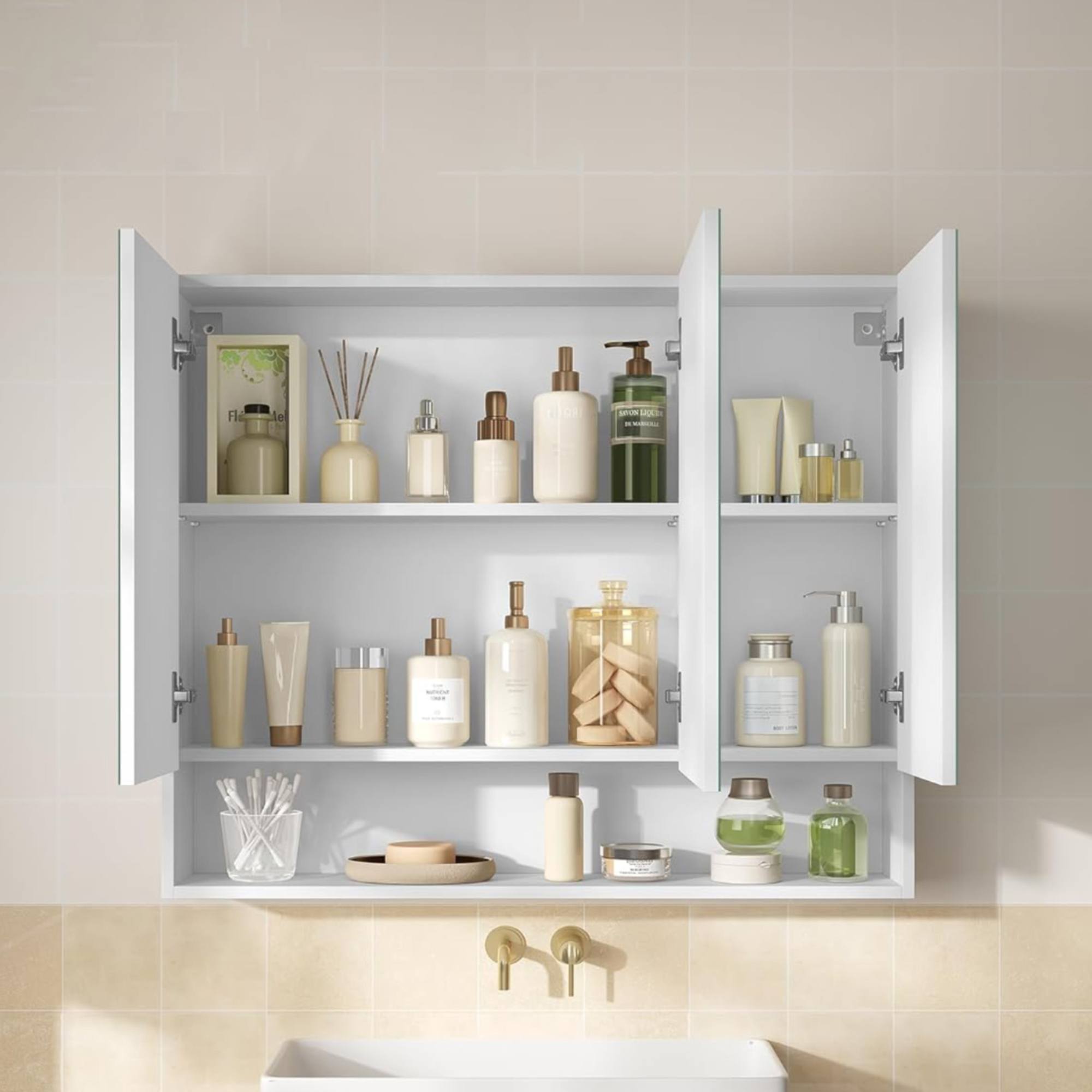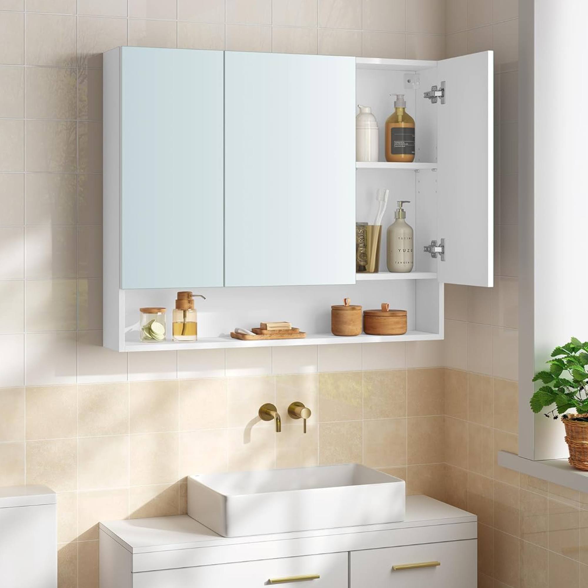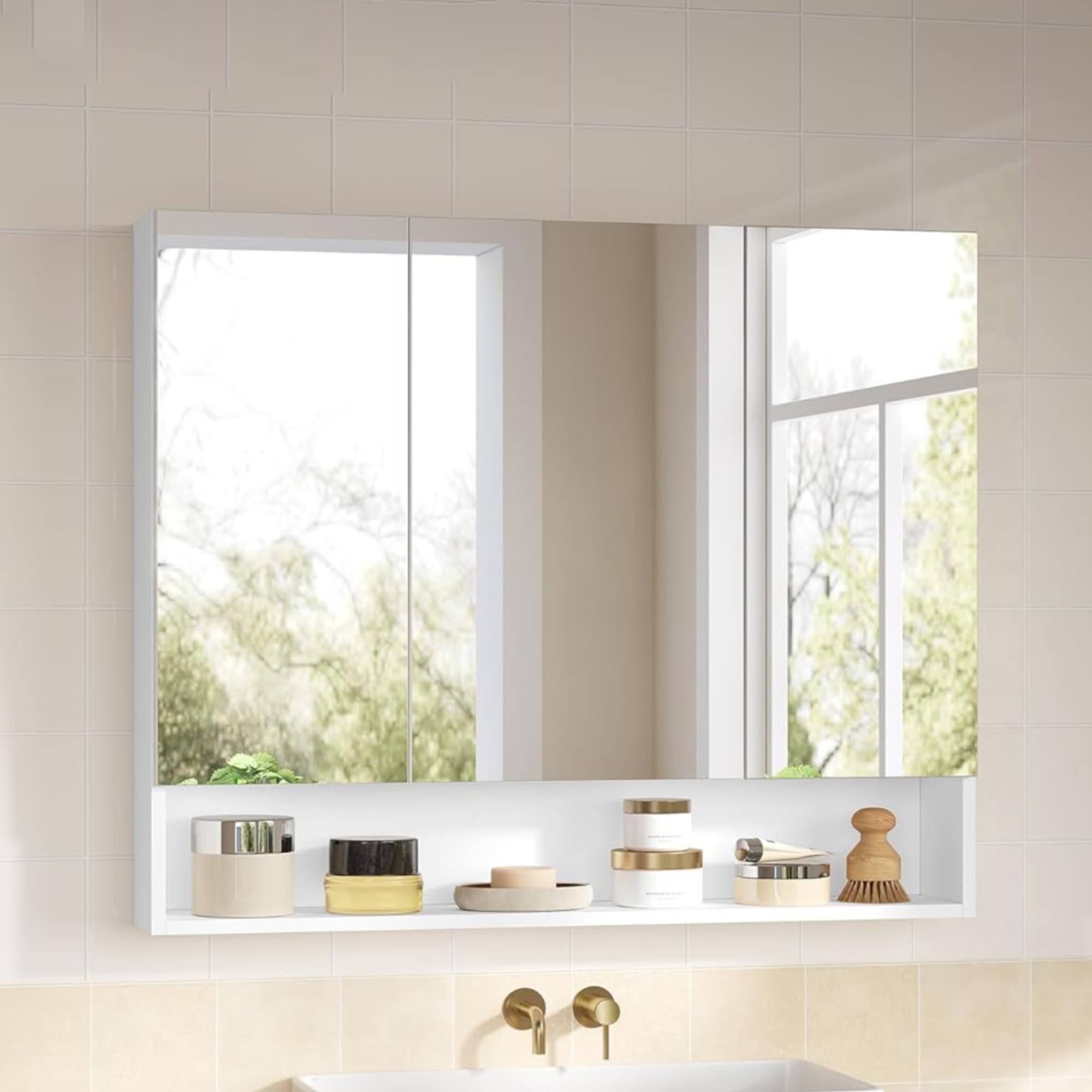 Nižšie sa nachádza otvorená polica, kde môžete umiestniť pleťový krém, parfum alebo potreby na holenie.