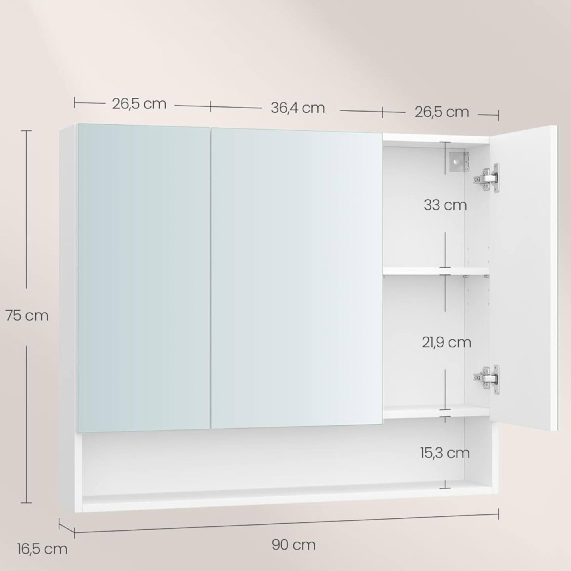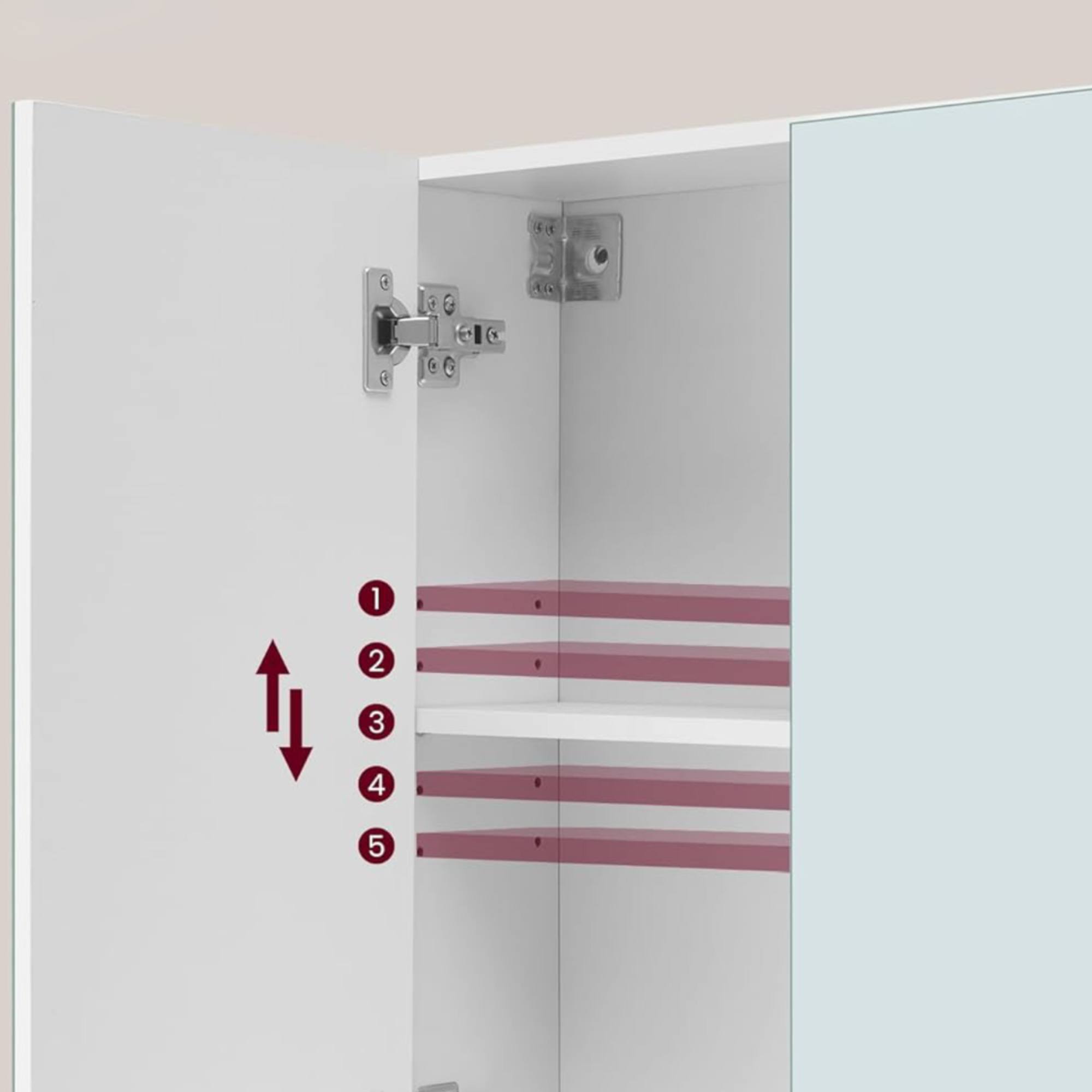 Skrinka je delená na dve časti a za jej dvierkami sa nachádzajú dve vložené police, na ktoré si môžete uložiť kozmetické prípravky aj zubnú kefku.