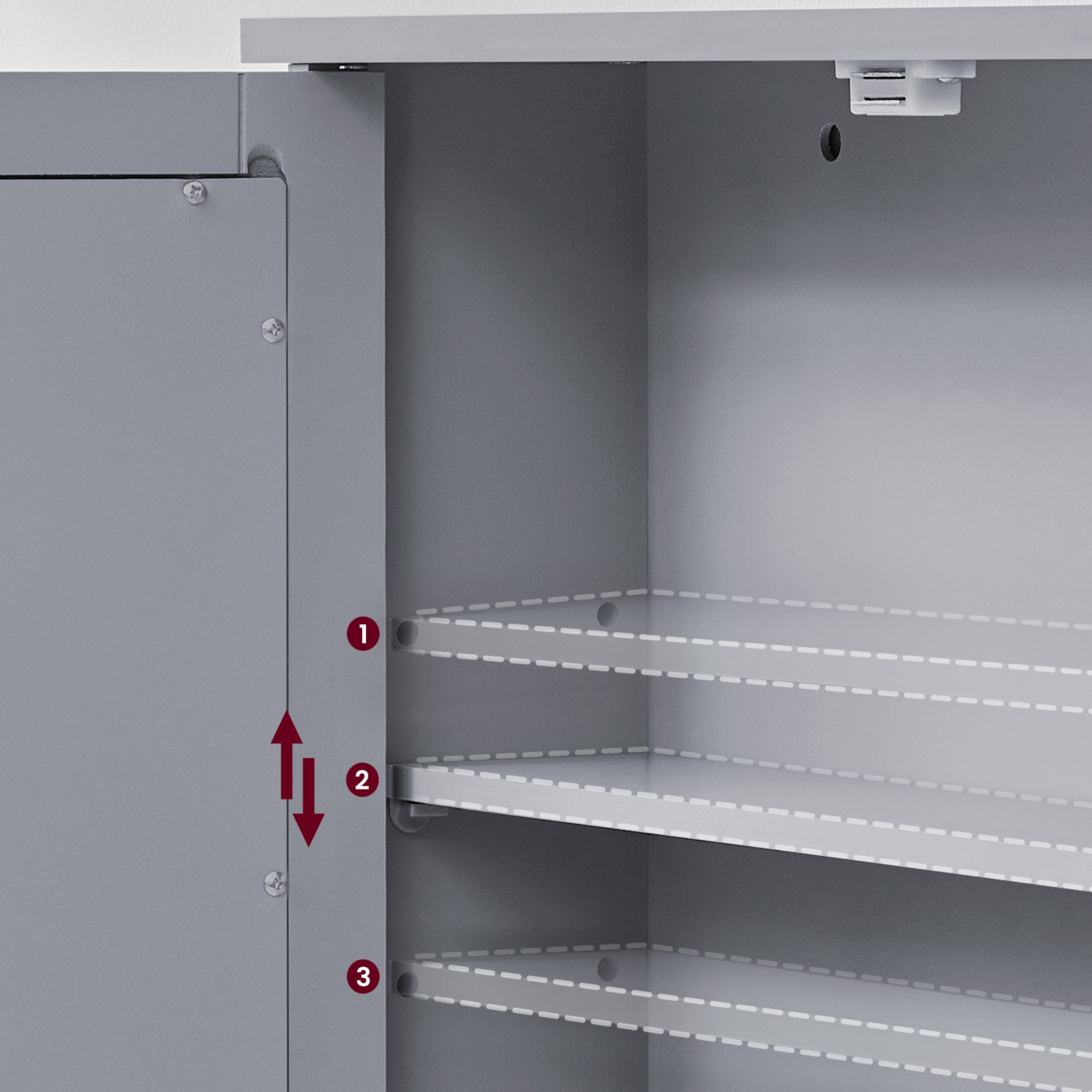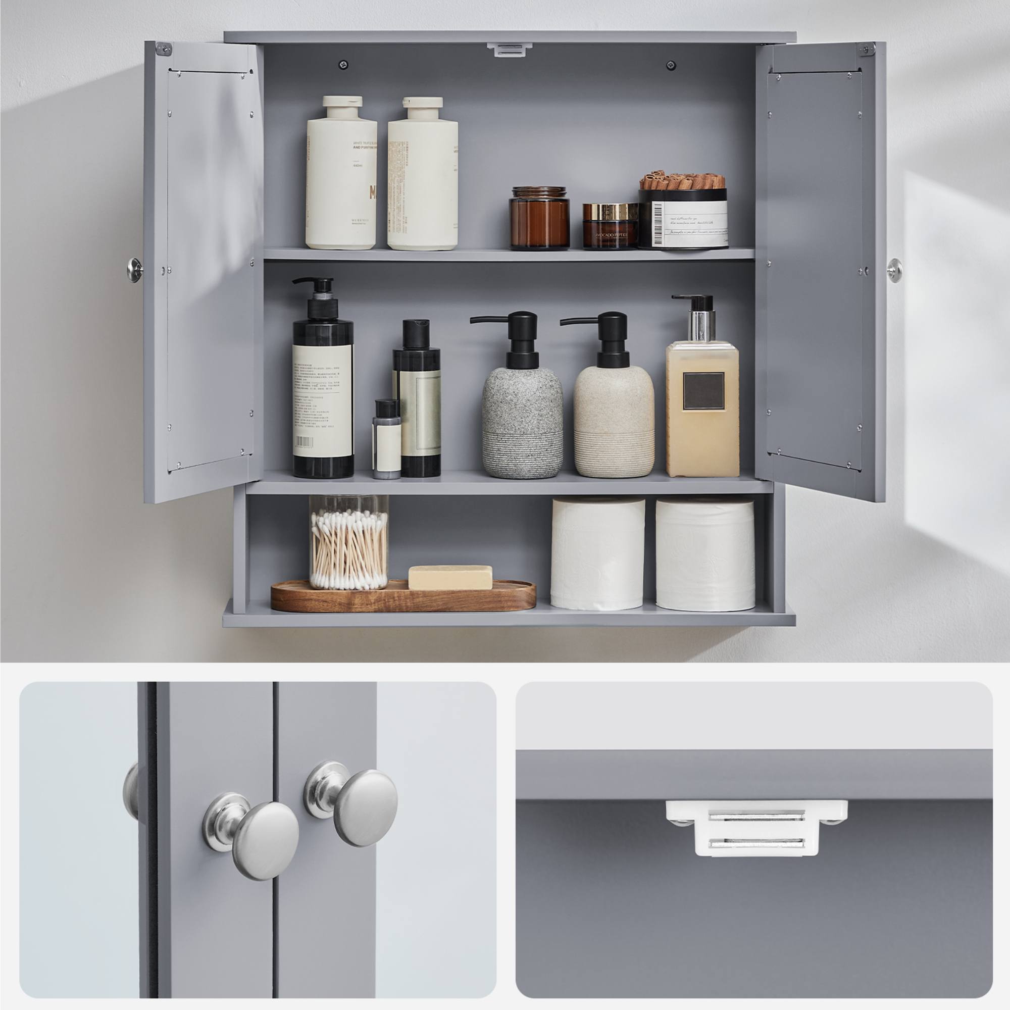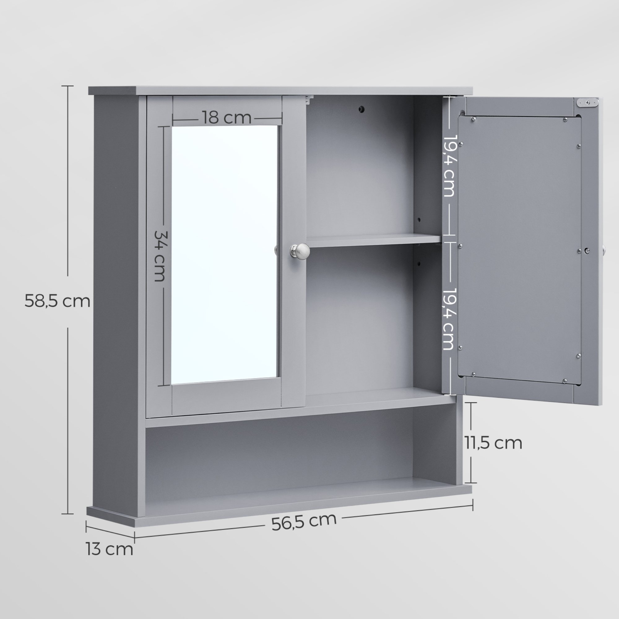 Skrinka disponuje 1 nastaviteľnou policou, ktorá je umiestnená za dvierkami. Aby sa s týmito dvierkami dobre manipulovalo, sú vybavené rúčkami. Na dvierkach sa nachádza zrkadlová plocha.