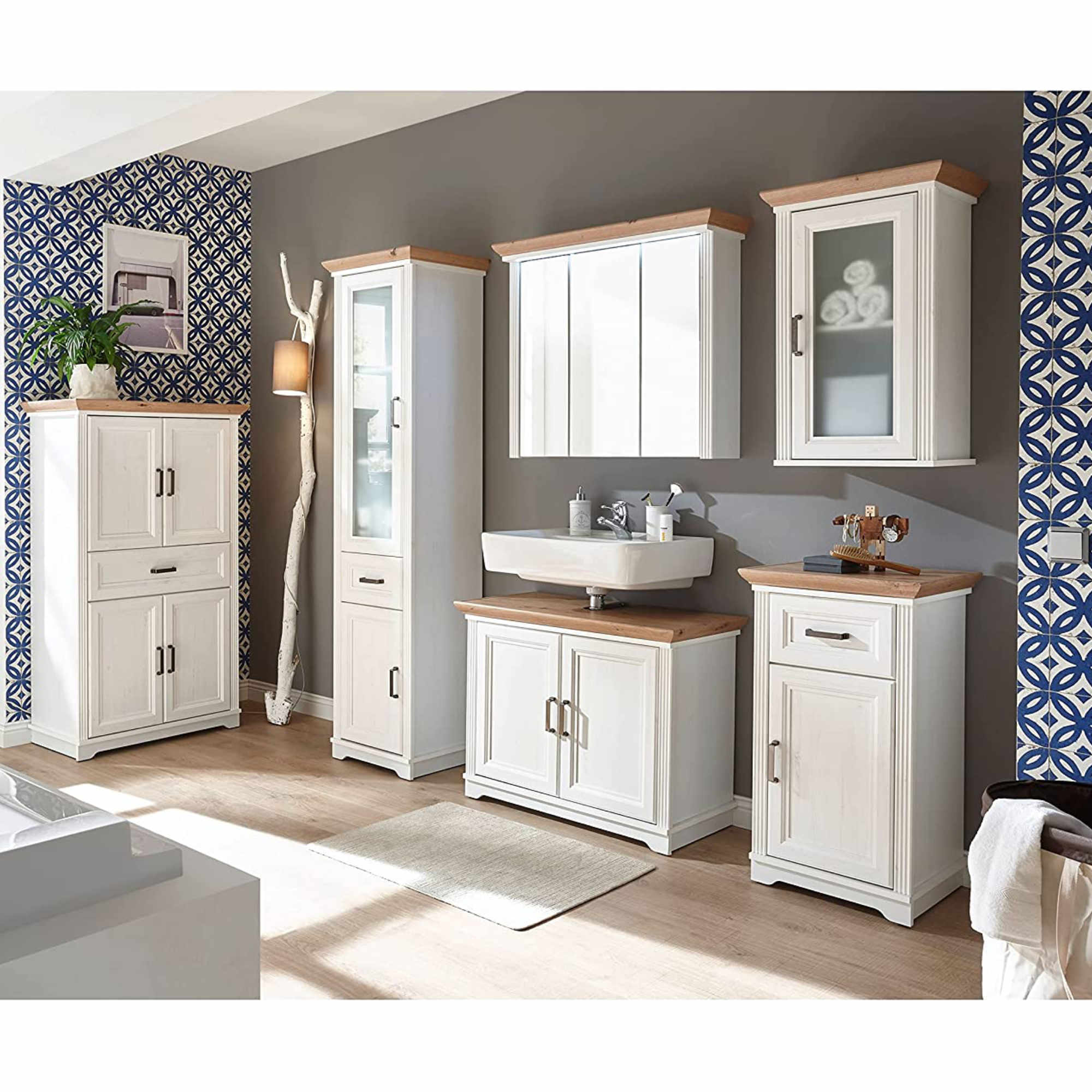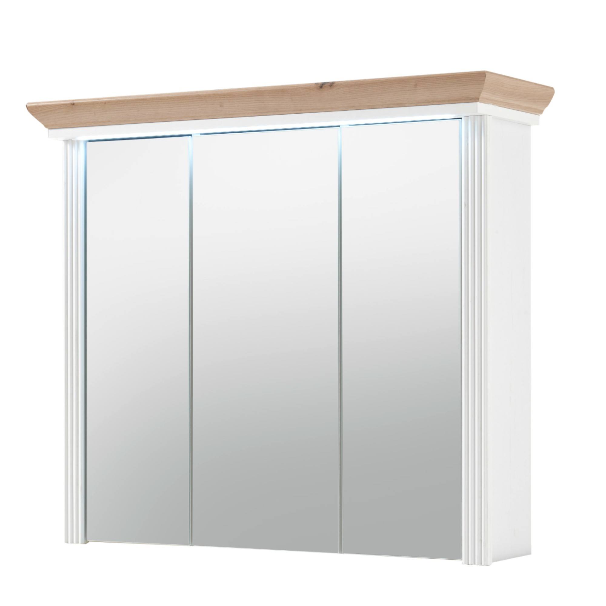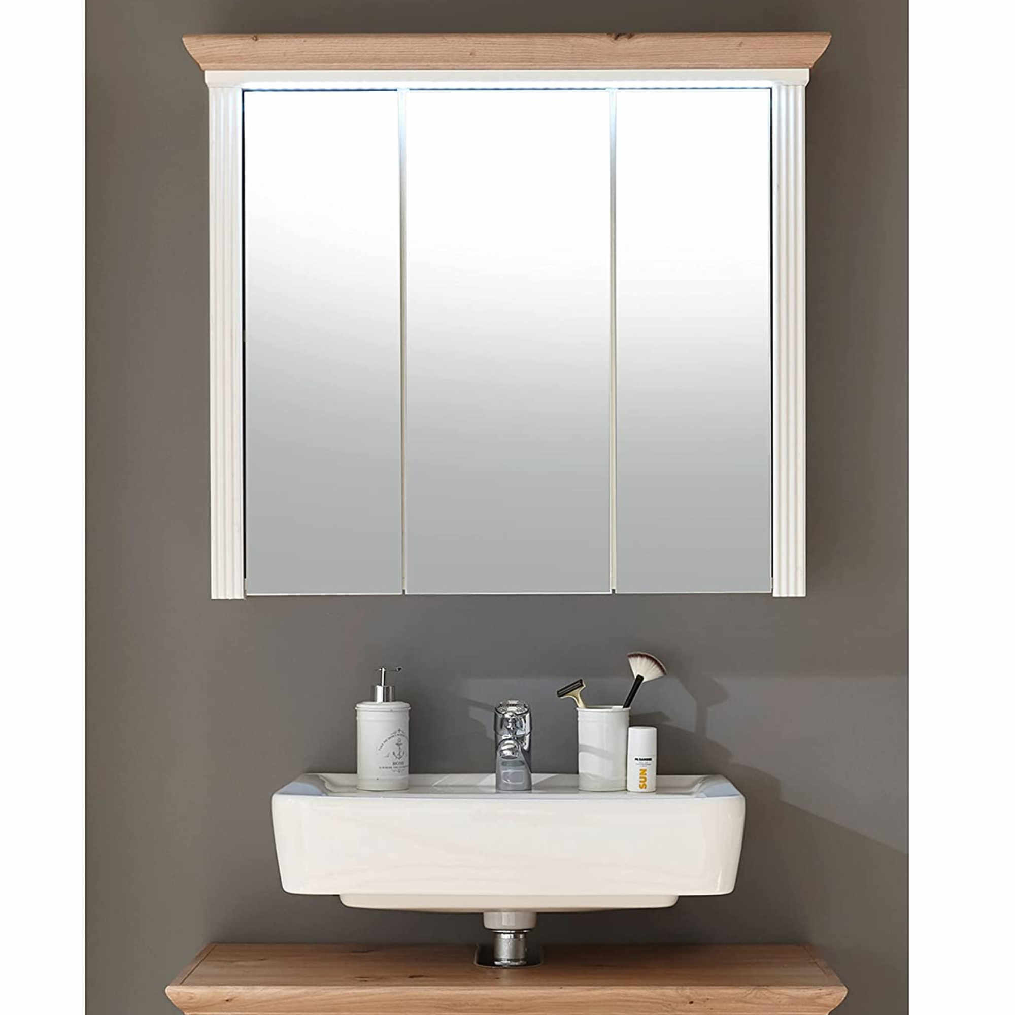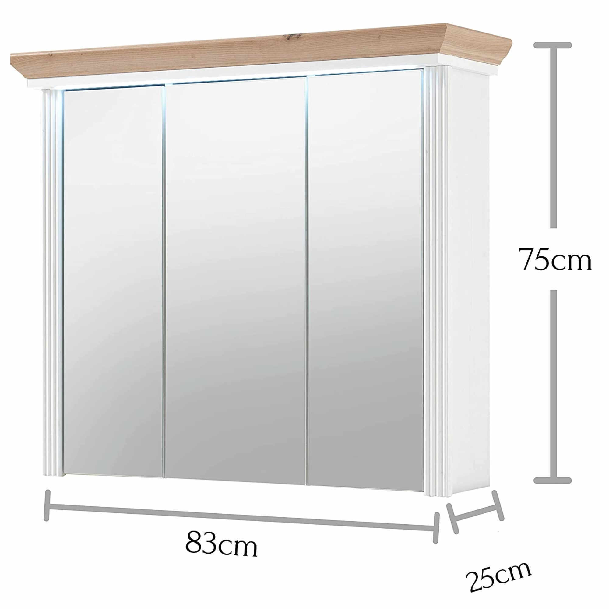 Veľké zrkadlové dvierka rozjasnia a opticky zväčšia priestor a navyše skrinka ponúka veľký úložný priestor na kozmetické a hygienické prípravky . Svojím čistým vyhotovením vnesie do vašej kúpeľne nádych vidieckej romantiky. Odkladací priestor za dvierkami je rozdelený policami. Stredné dvierka sú variabilné a pri montáži si môžete zvoliť či sa budú otvárať vpravo alebo vľavo. Iste oceníte aj integrované LED osvetlenie, ktoré je súčasťou skrinky.