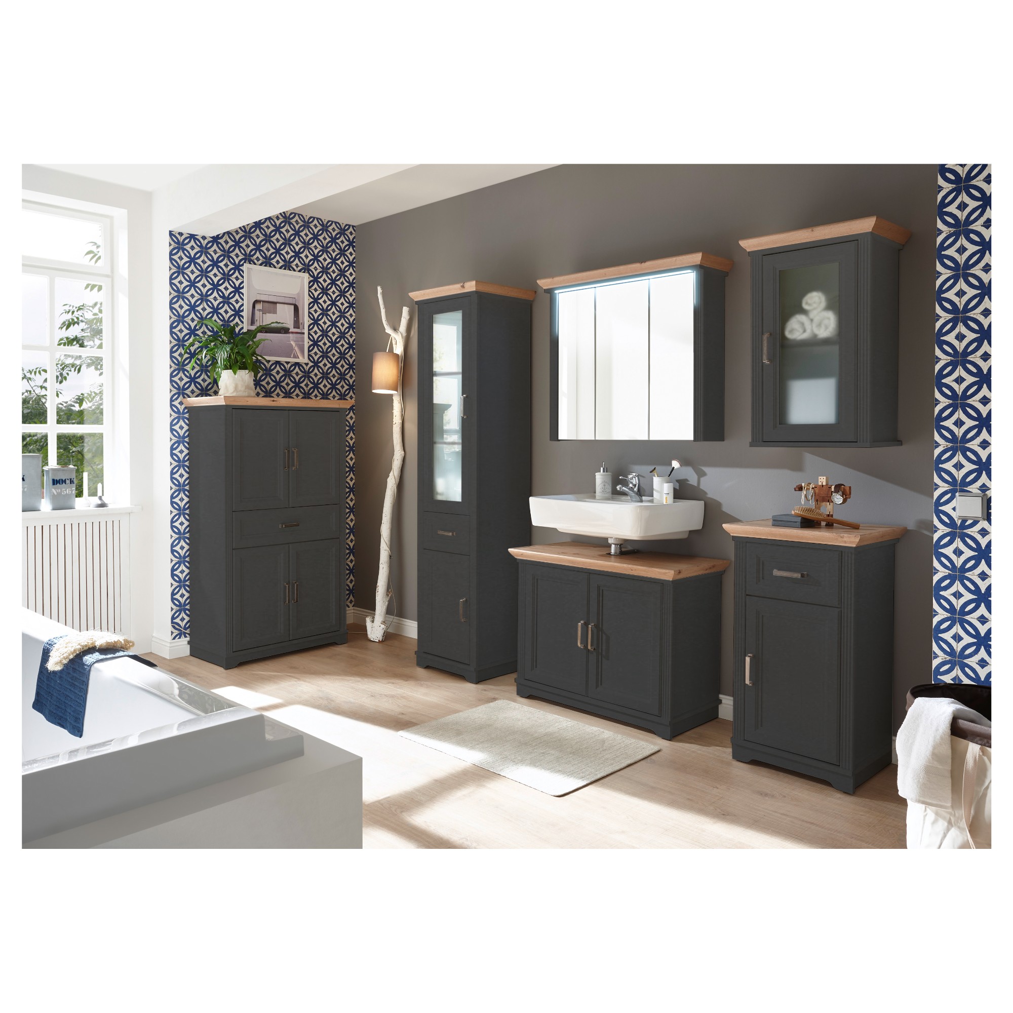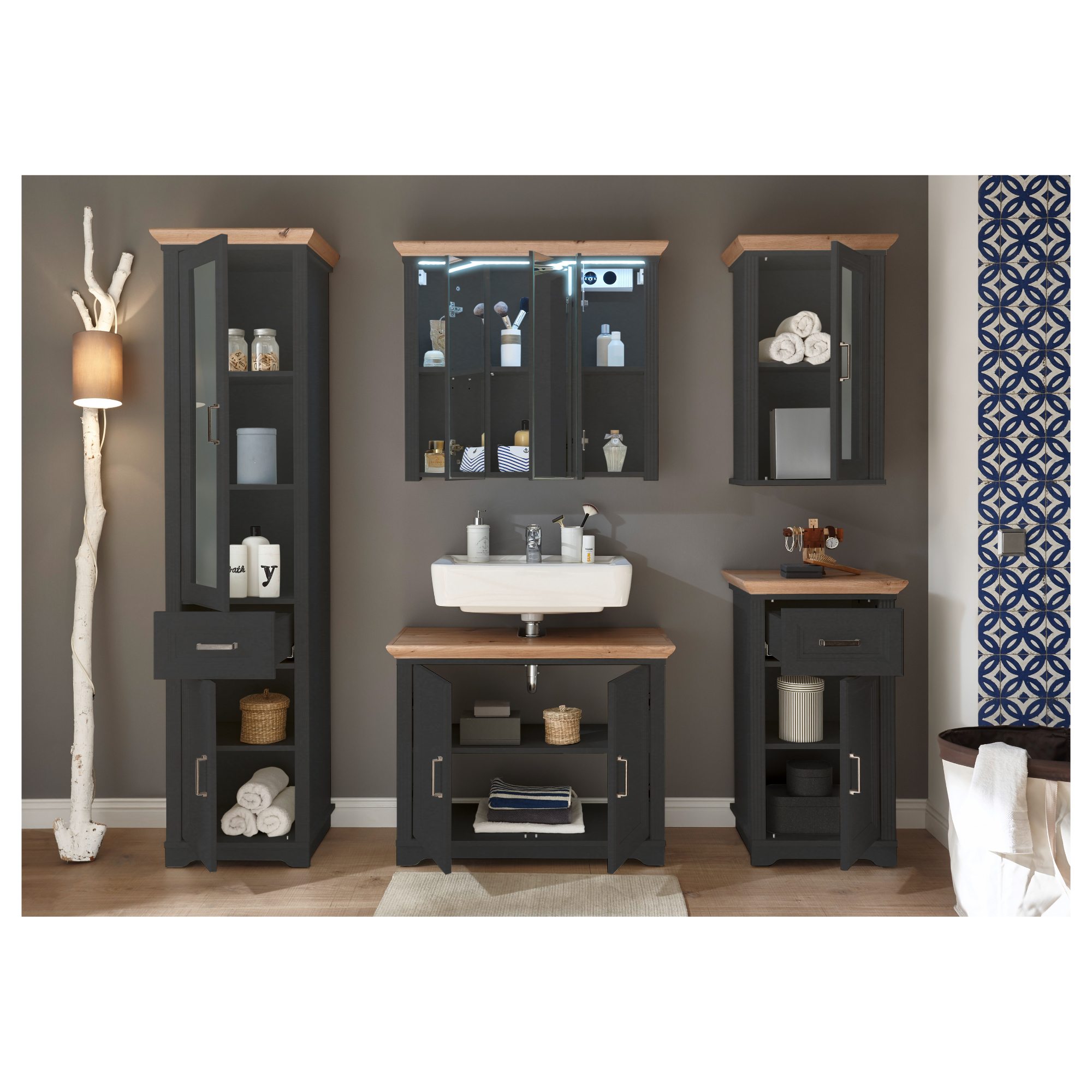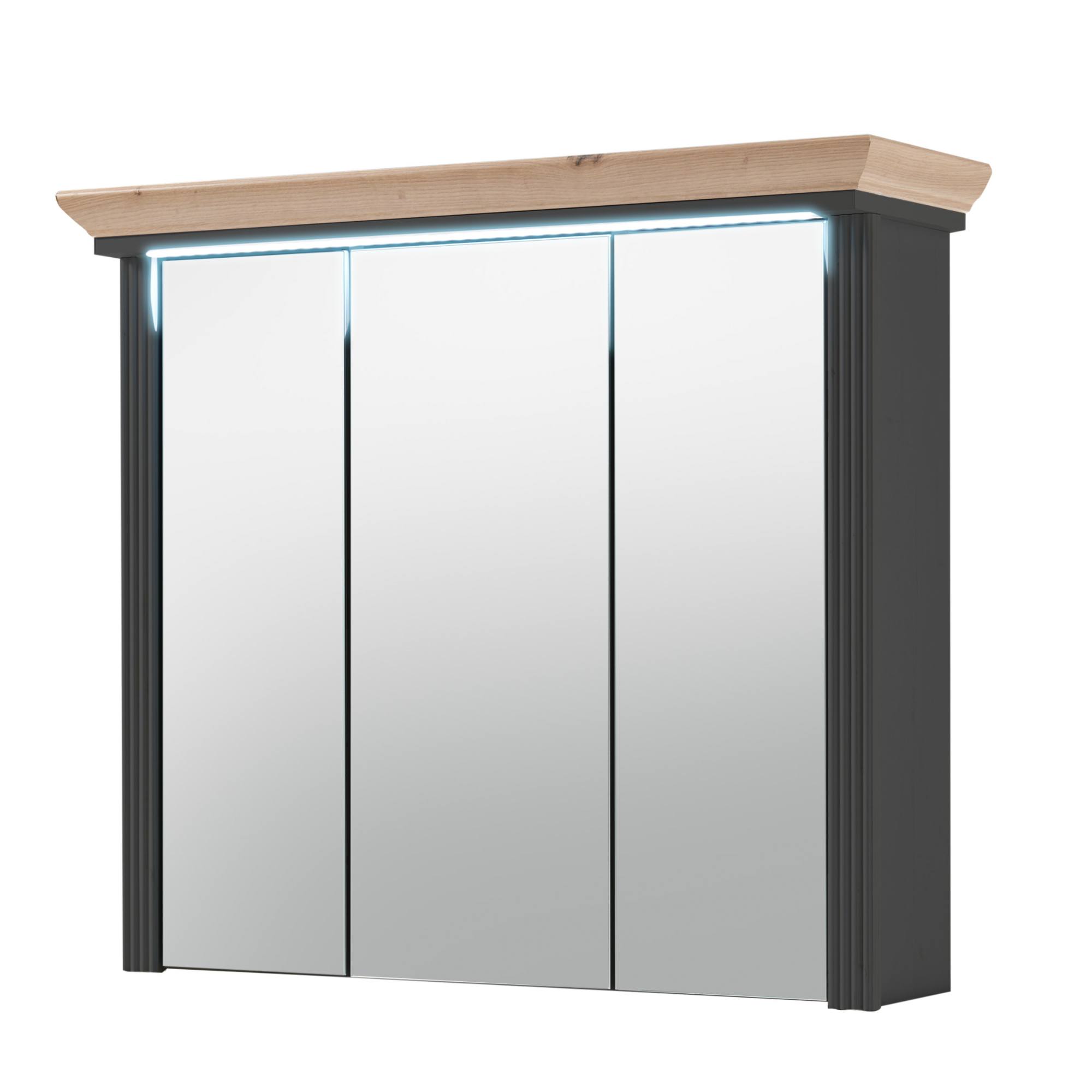 Veľké zrkadlové dvierka rozjasnia a opticky zväčšia priestor a navyše skrinka ponúka veľký úložný priestor na kozmetické a hygienické prípravky . Svojím čistým vyhotovením vnesie do vašej kúpeľne nádych vidieckej romantiky. Odkladací priestor za dvierkami je rozdelený policami. Stredné dvierka sú variabilné a pri montáži si môžete zvoliť či sa budú otvárať vpravo alebo vľavo. Iste oceníte aj integrované LED osvetlenie, ktoré je súčasťou skrinky.
