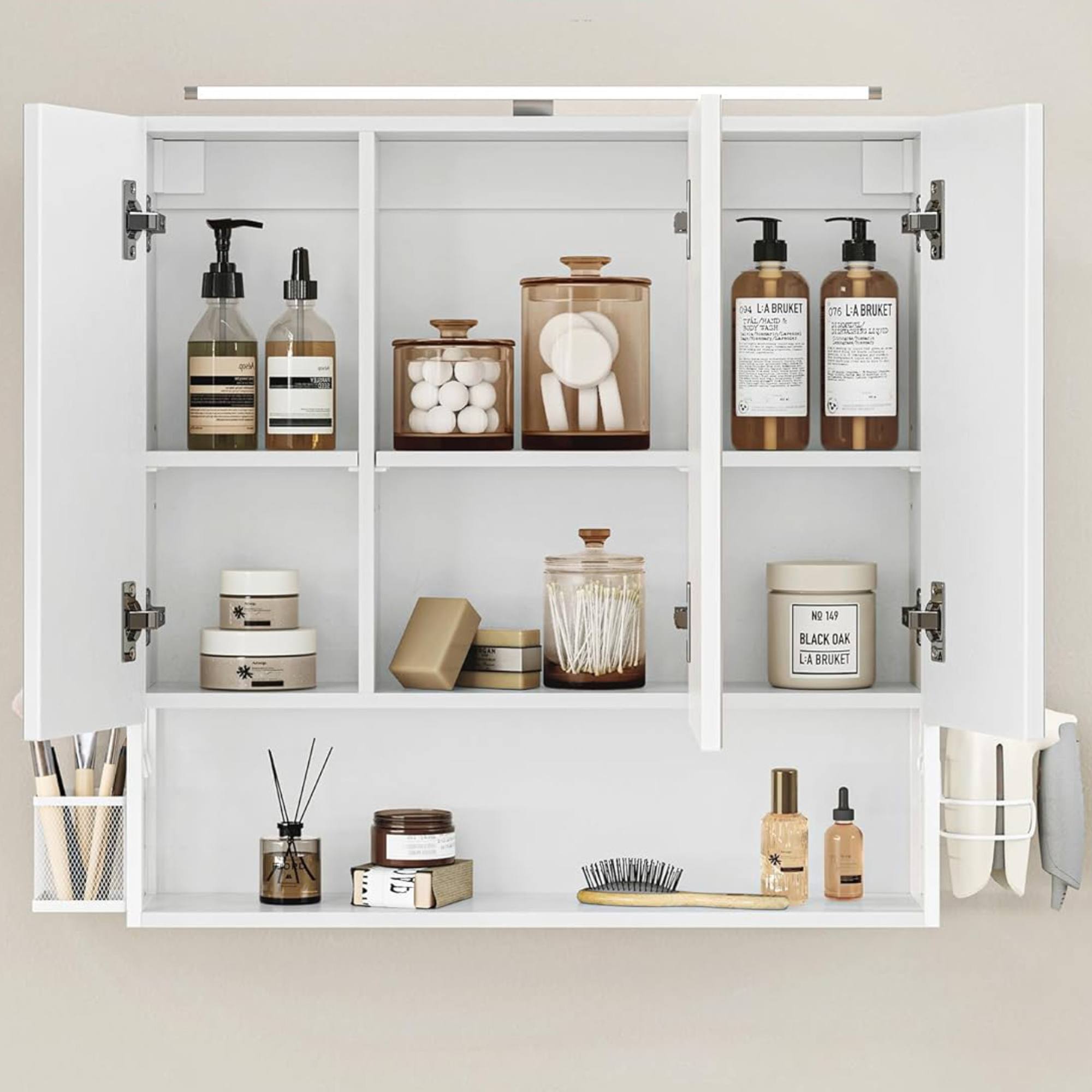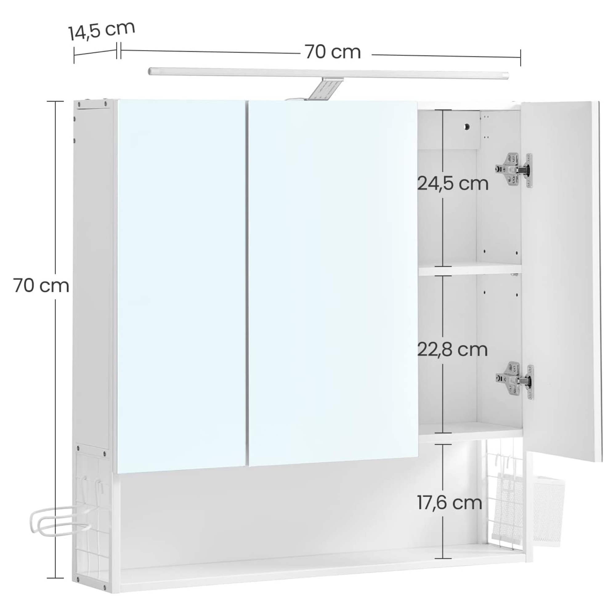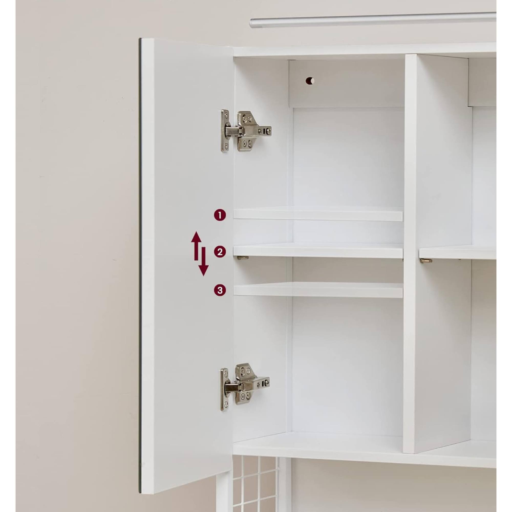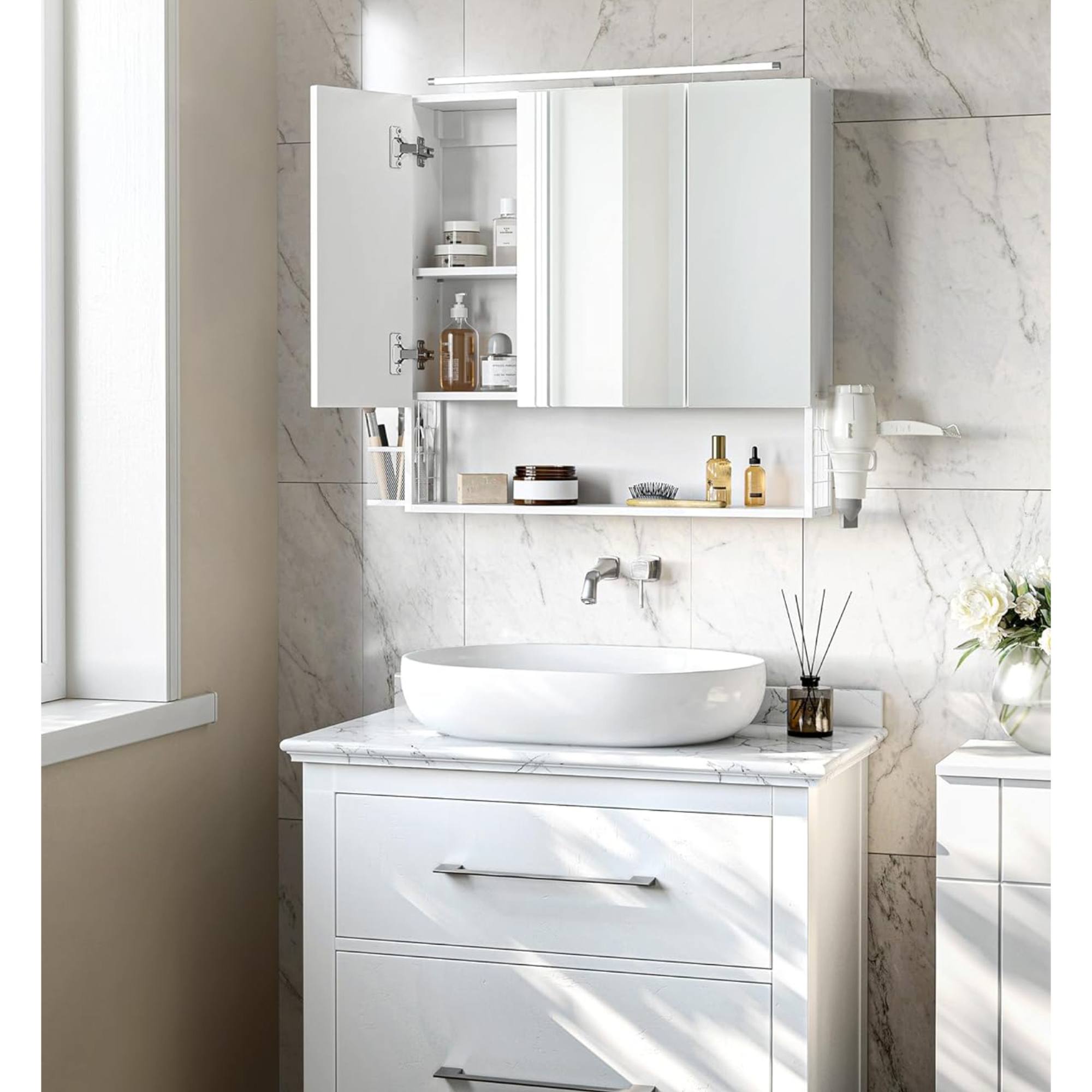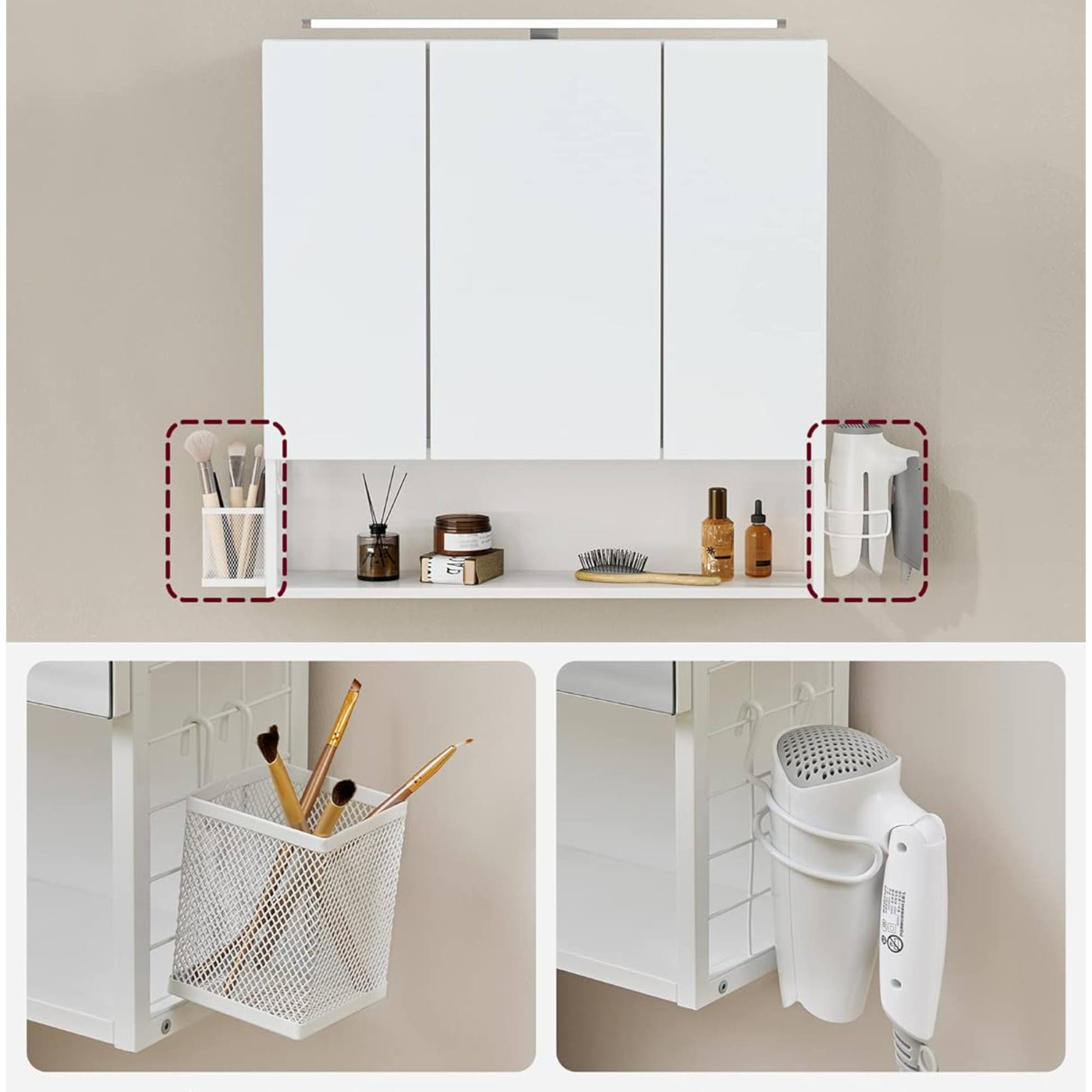 Za zrkadlovými dvierkami nájdete odkladací priestor delený policami, ktorý poskytne zázemie na kozmetické a hygienické prípravky. Nájdete tu aj otvorenú priehradku s úložným košom a držiakom na fén. Integrované LED osvetlenie zaistí dostatok svetla, ale dokáže vytvoriť v kúpeľni tú pravú relaxačnú atmosféru.