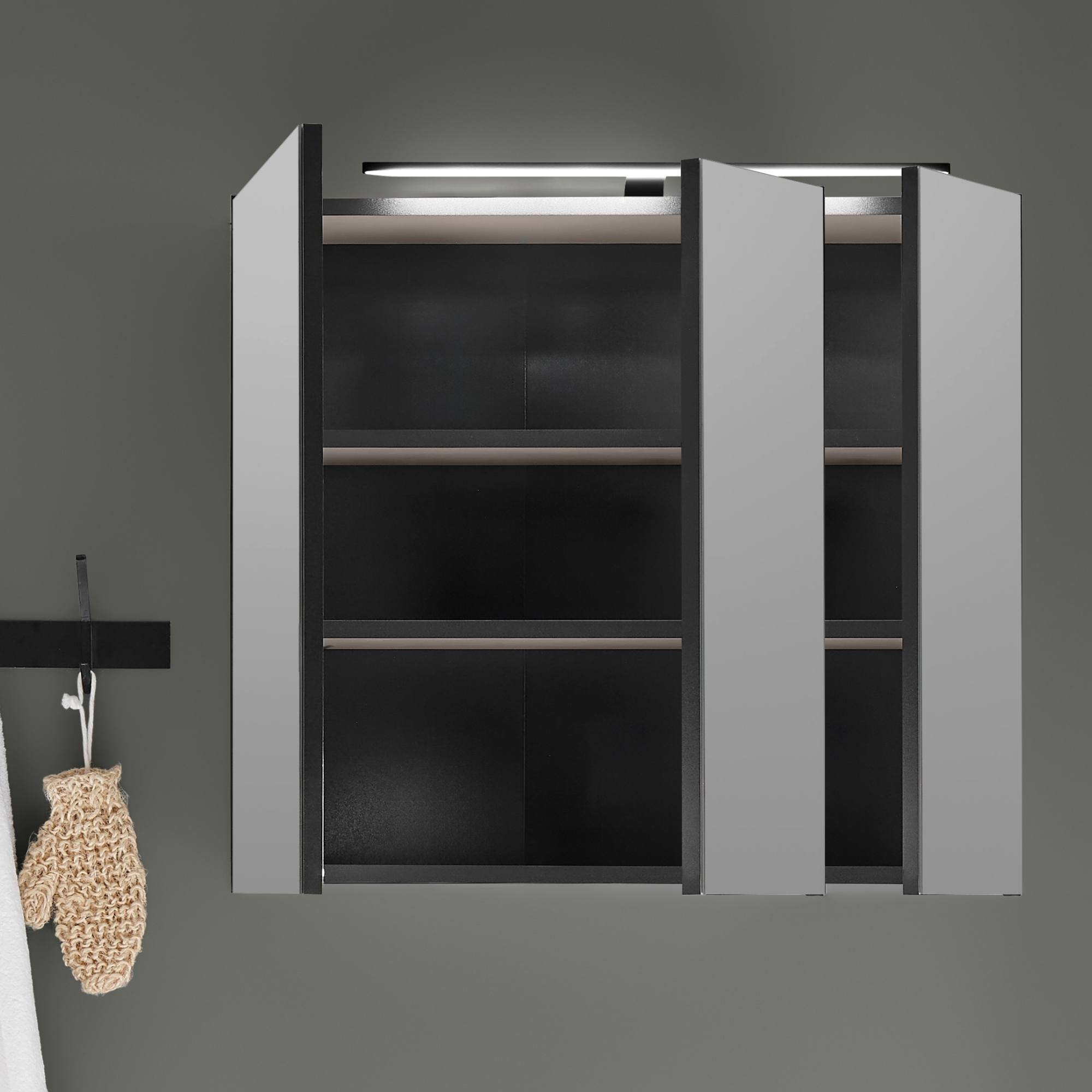 Za zrkadlovými dvierkami skrinky sa nachádzajú 4 nastaviteľné vložené police, na ktoré si môžete prehľadne uložiť všetko, čo v kúpeľni potrebujete mať po ruke. Nechýba ani LED osvetlenie.