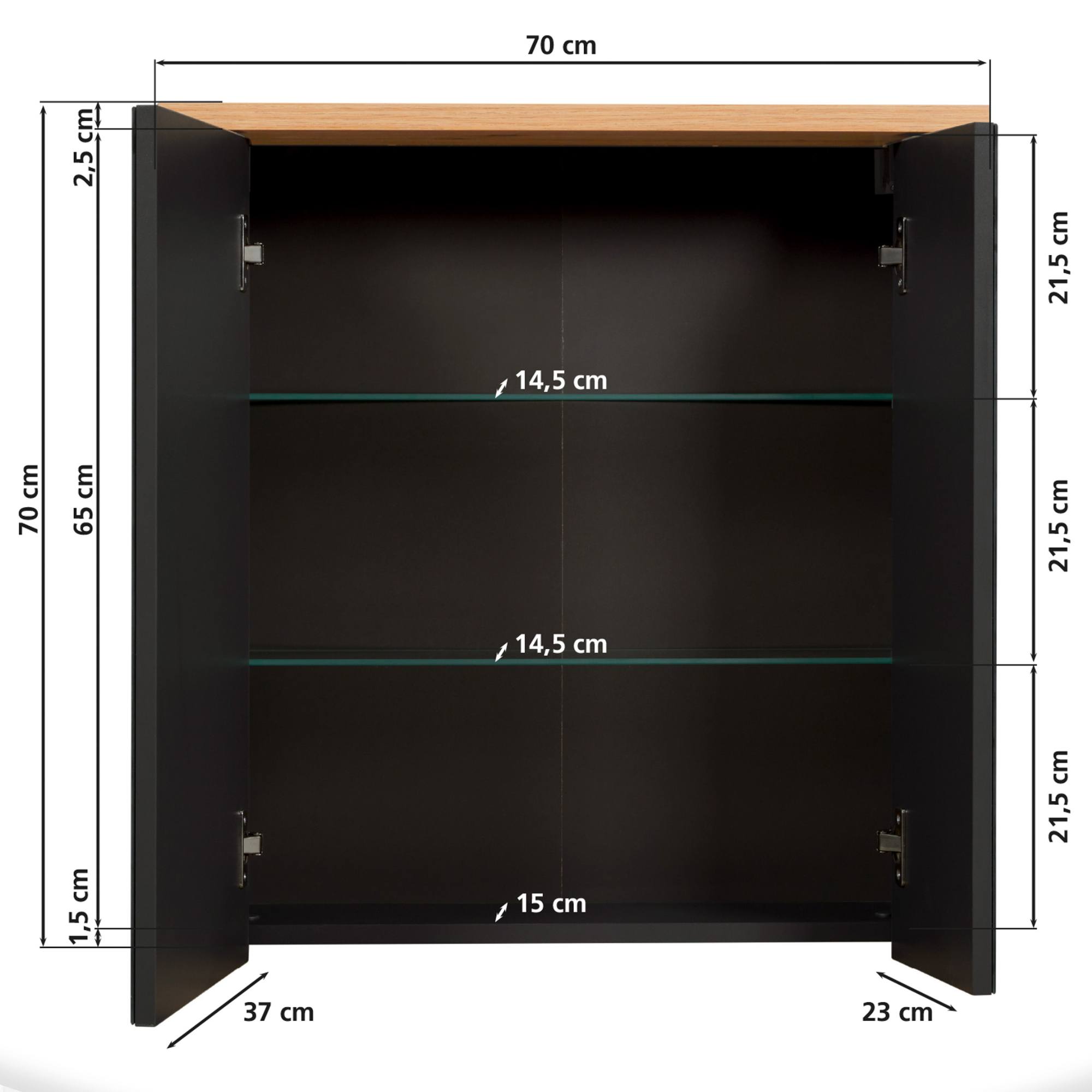Za dvierkami, na ktorých prednej strane je umiestnená zrkadlová plocha, sa nachádzajú 2 vložené police z tvrdeného skla. Na tie si môžete prehľadne uložiť všetko, čo v kúpeľni potrebujete mať po ruke.