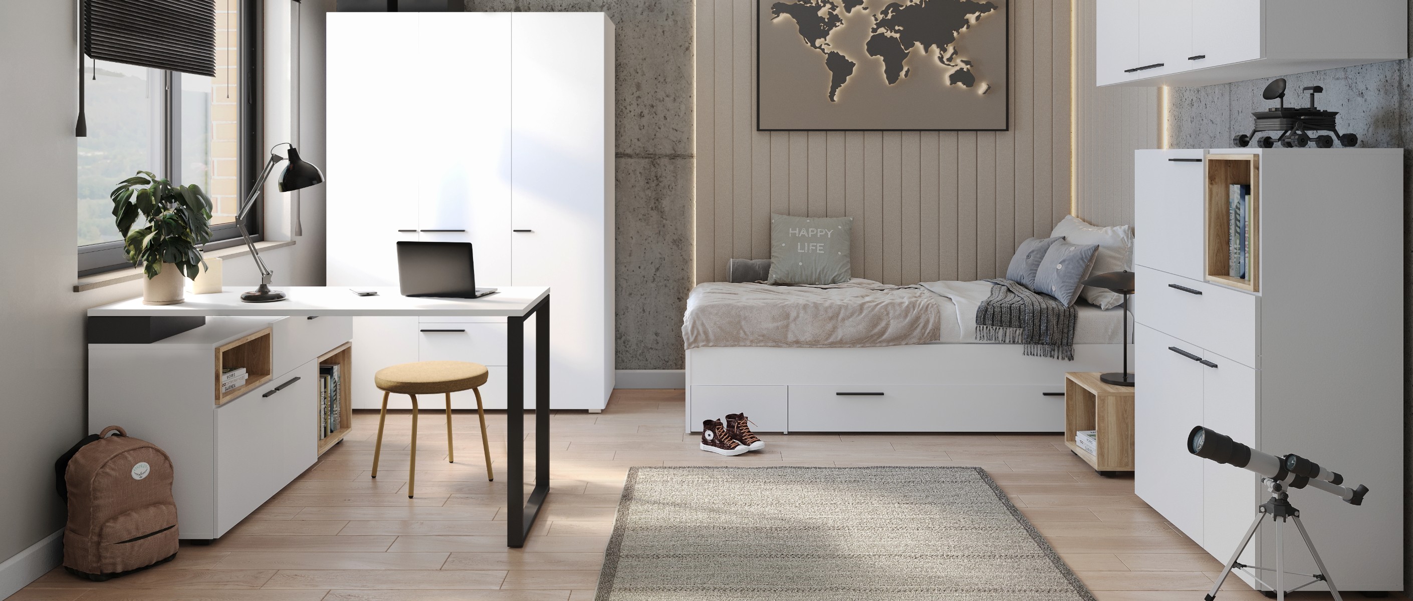 Séria produktov MARLOW zabezpečí deťom zázemie, v ktorom bude radosť tráviť čas. Nábytok je vyrobený z odolného, dobre udržiavateľného lamina. Farebné vyhotovenie v neutrálnej bielej – z ktorej vyčnievajú kontrastné čierne rúčky – s otvoreným úložným priestorom v dekore duba castello dá vzniknúť modernej izbe pre chlapcov a dievčatá.