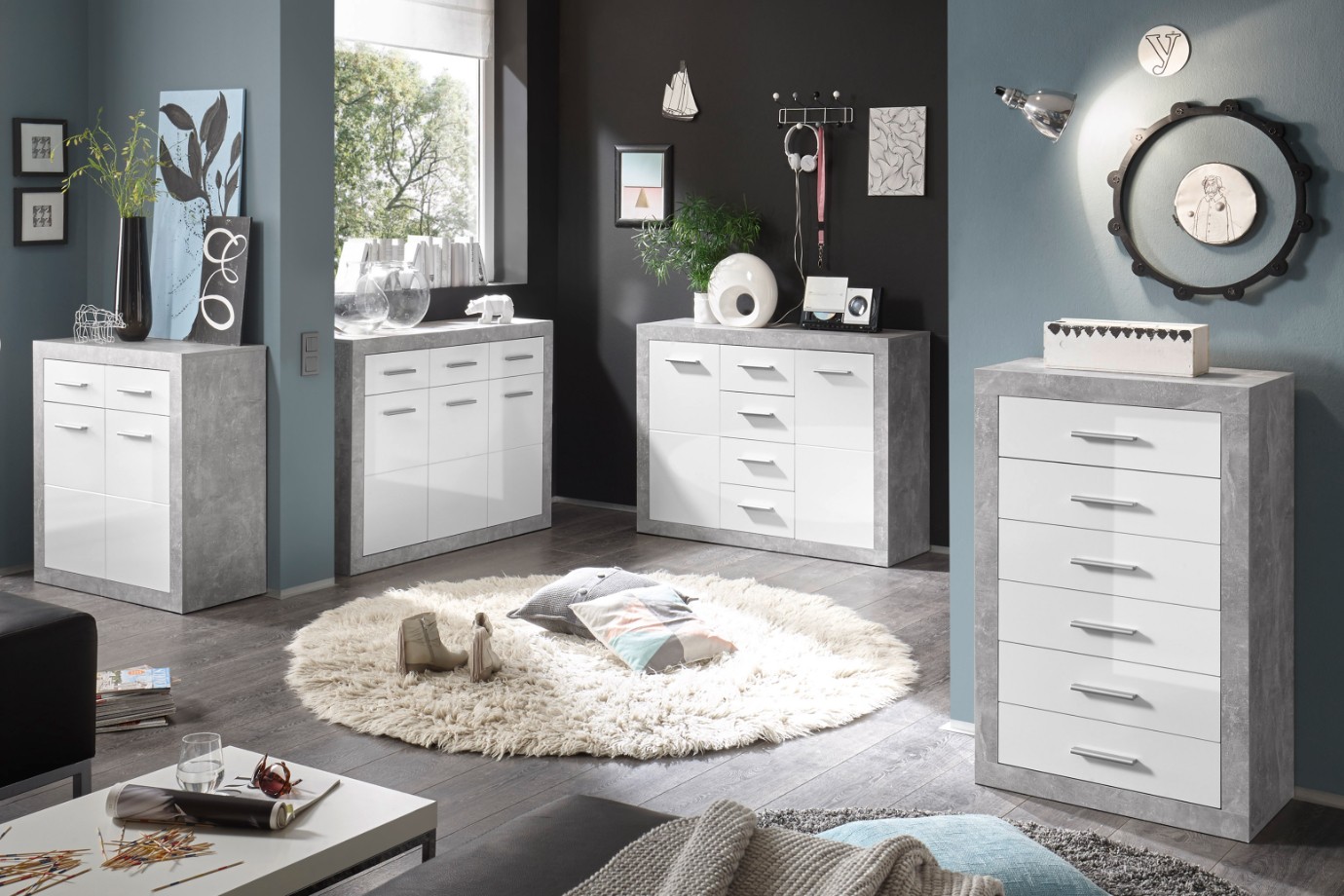 Kolekcia sektorového nábytku STONE je dôkazom, že sivá interiéru skrátka pristane. Kombinácia napodobeniny betónu a neutrálnej bielej je jednou z najpopulárnejších kombinácií súčasnosti. Vďaka širokému orámovaniu korpusu získavajú jednotlivé elementy exkluzívny vzhľad. Variabilne umiestnený nábytok programu skrýva dostatok toľko potrebného úložného priestoru a vašej obývacej izbe dodá jedinečnú atmosféru.